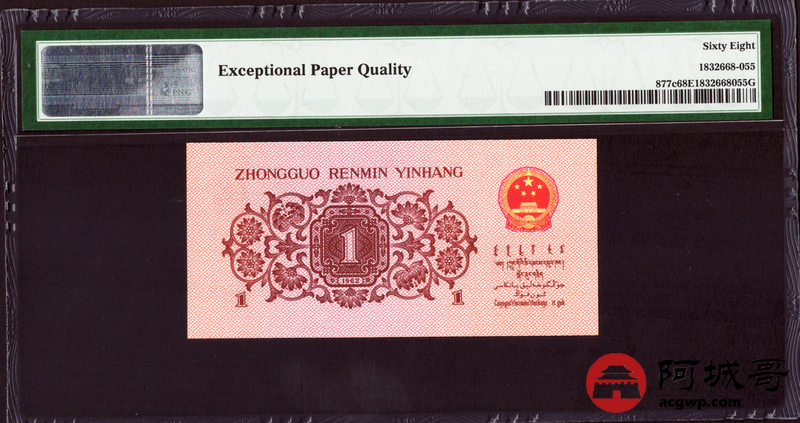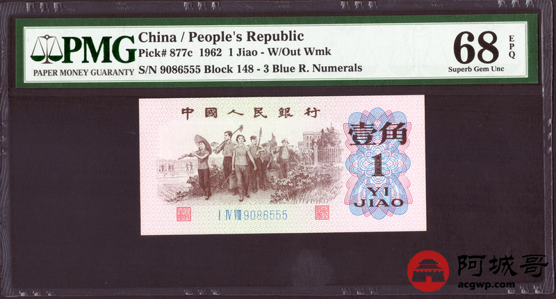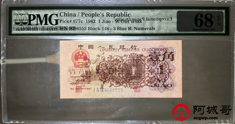 Lot:38 三版 1962年 壹角 蓝3冠 平版 好号全程无47 高分 PMG 68EPQ 尾号豹子号555