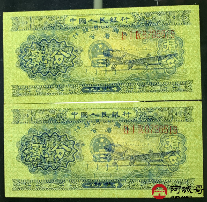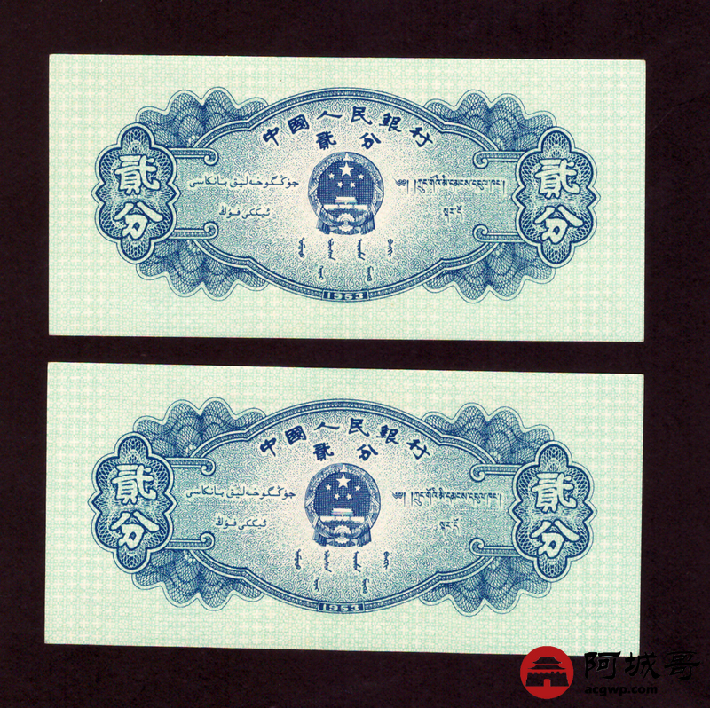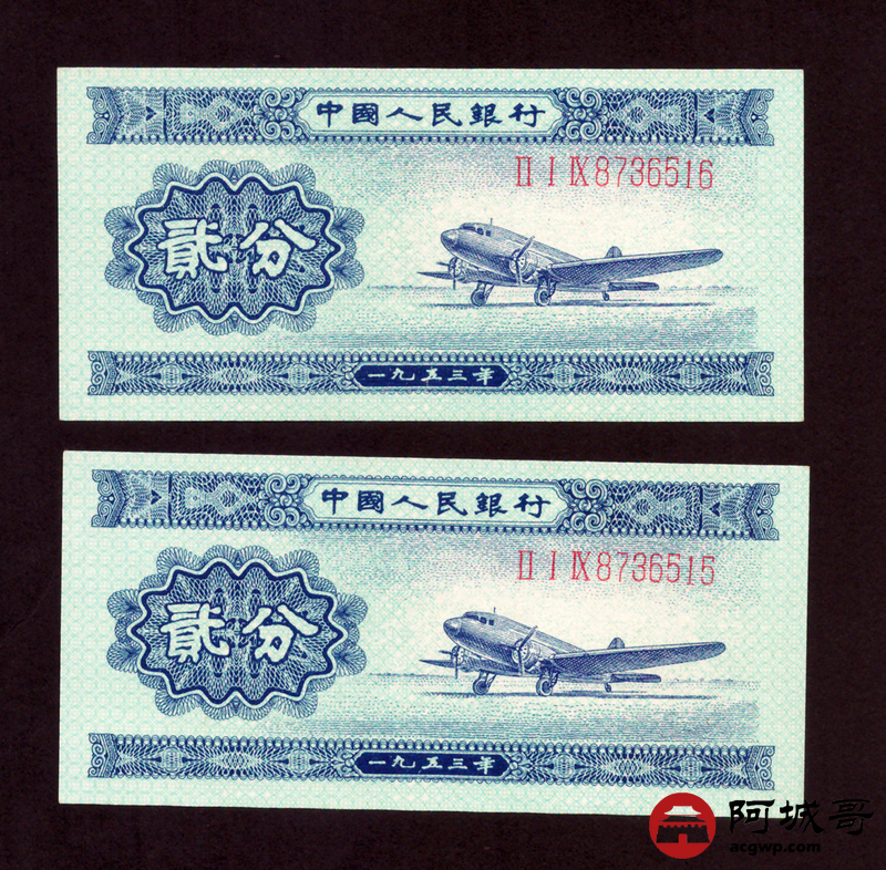 Lot:52 二版 1953年 中国人民银行 二分 2张连号 原票93至96成新