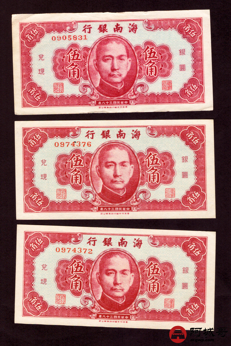 Lot:77 民国三十八年 海南银行 伍角 3张 两张跳连94成新 一张75成新