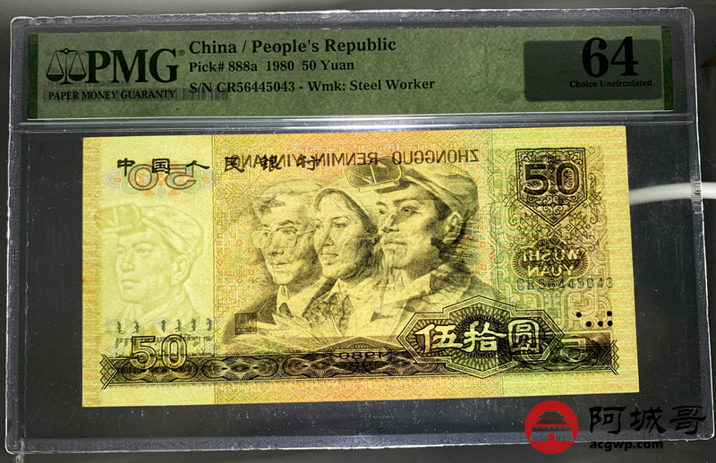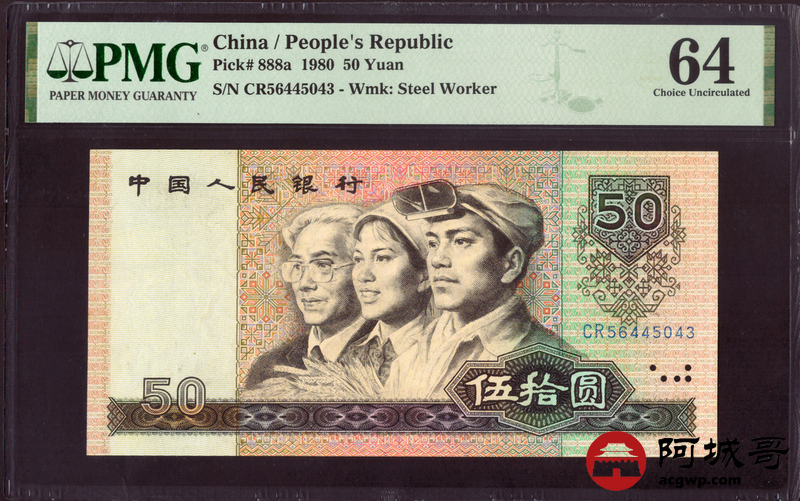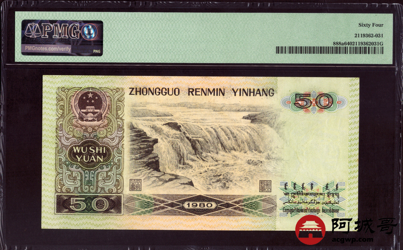 Lot:14 四版 1980年 50元 冠号CR天蓝版 PMG 64