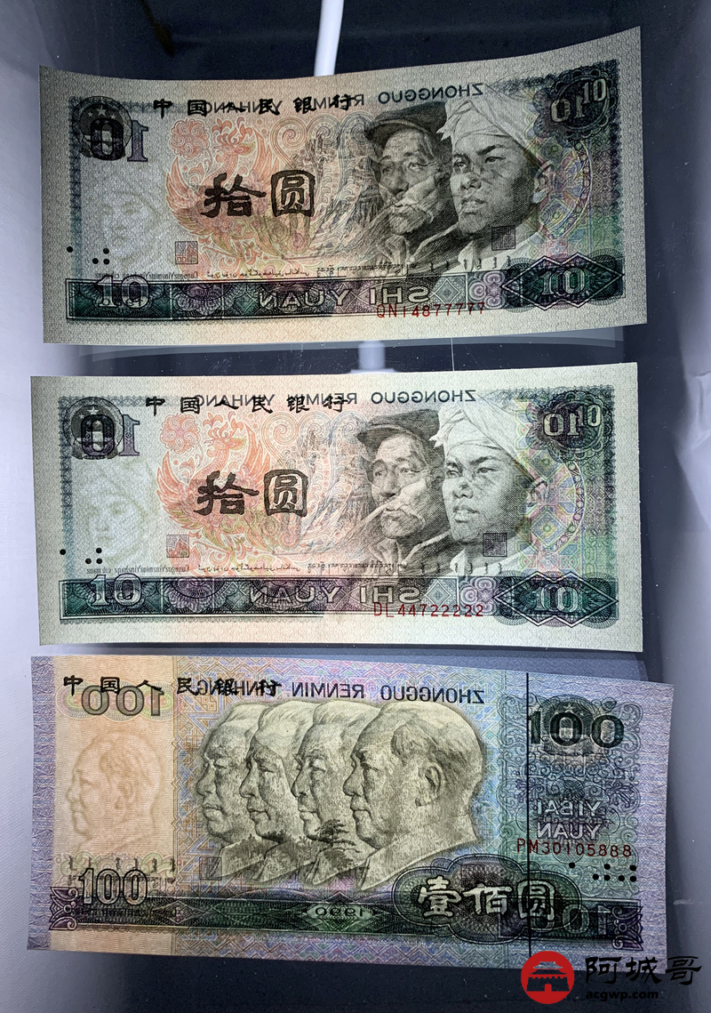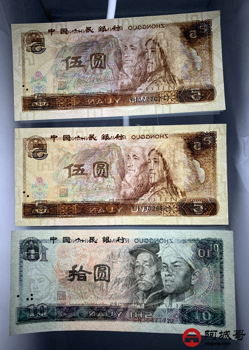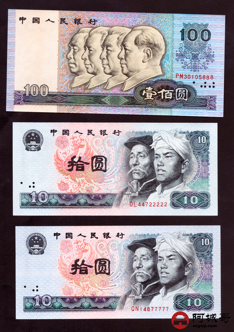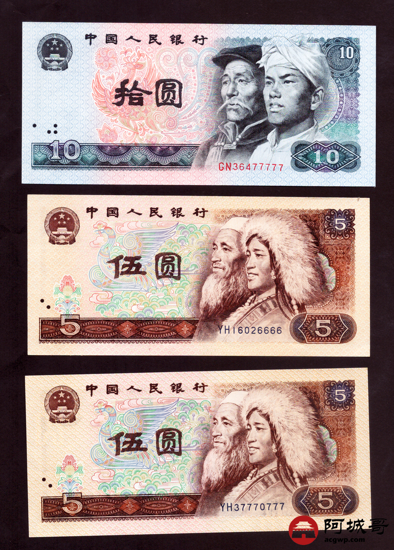 Lot:20 第四套人民币 5元、10元、100元 共6张 豹子号、狮子号、大象号 97至全新(尾号22222、777、77777)、 94成新(尾号888、6666)、其余9成新