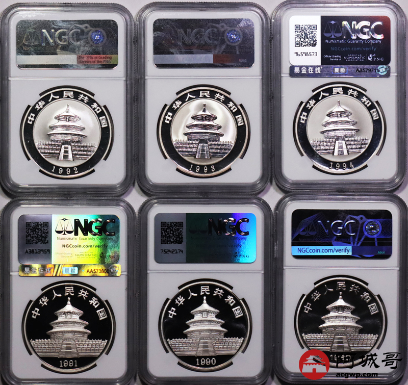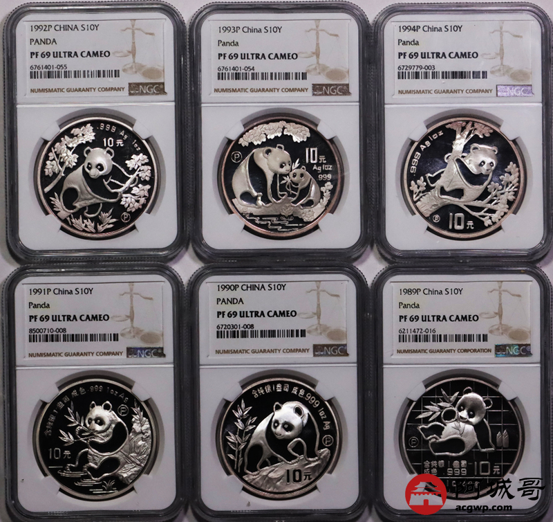 Lot:27 1898-1994熊猫1盎司银币 NGC PF69UC六枚