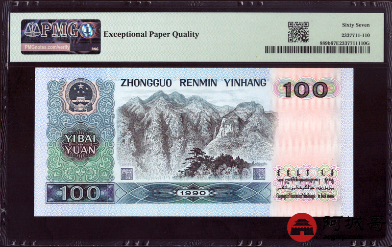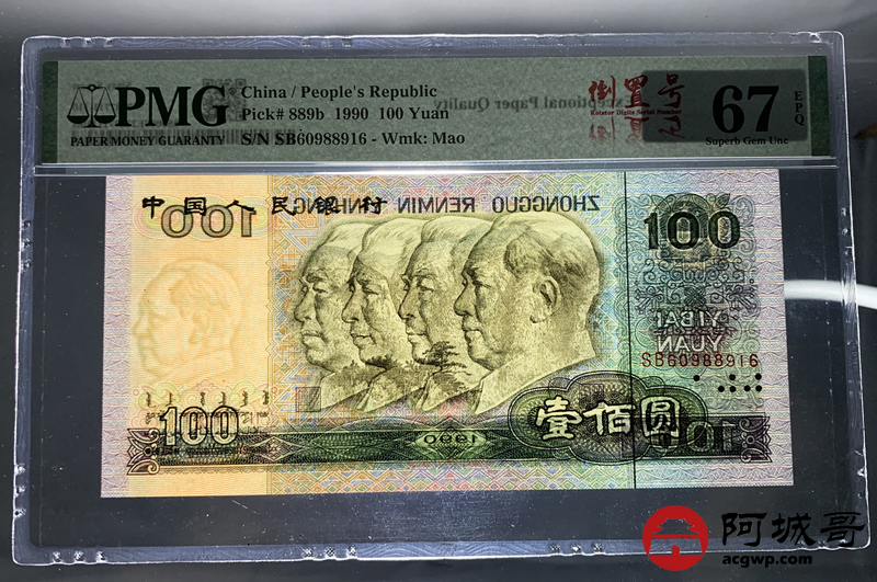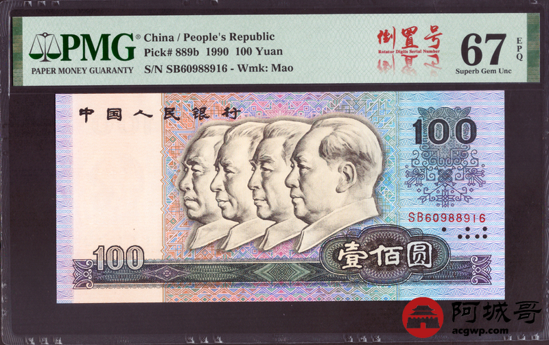 Lot:29 四版 1990年 中国人民银行壹佰圆 PMG 67EPQ 倒置号