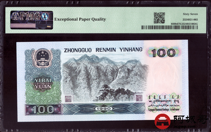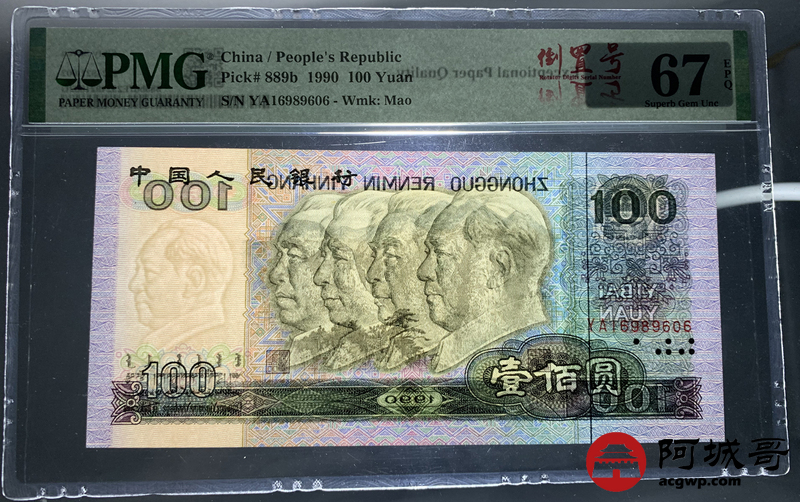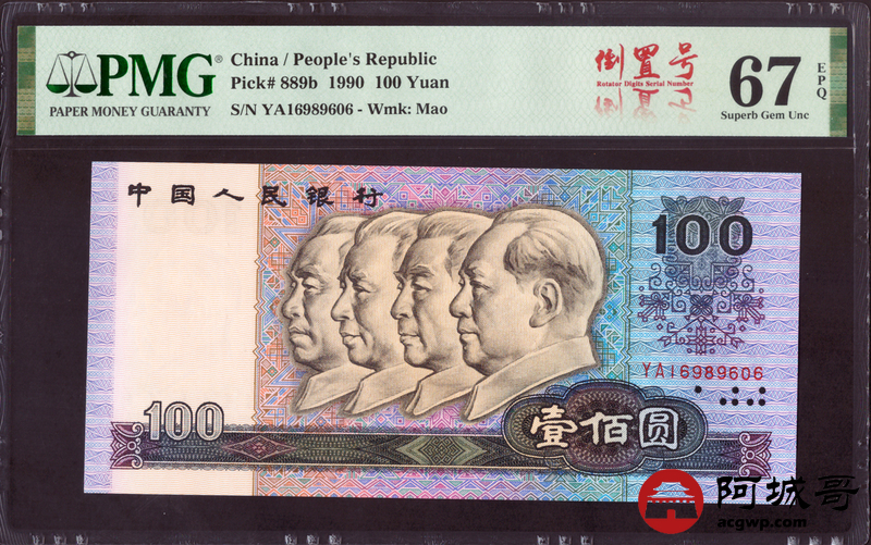 Lot:15 四版 1990年 中国人民银行壹佰圆 PMG 67EPQ 倒置号