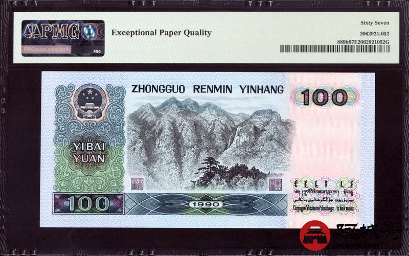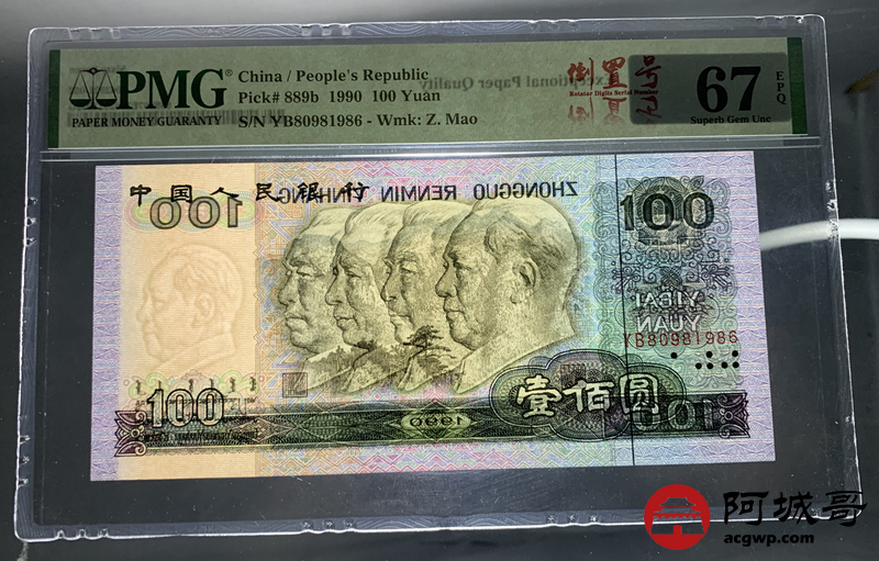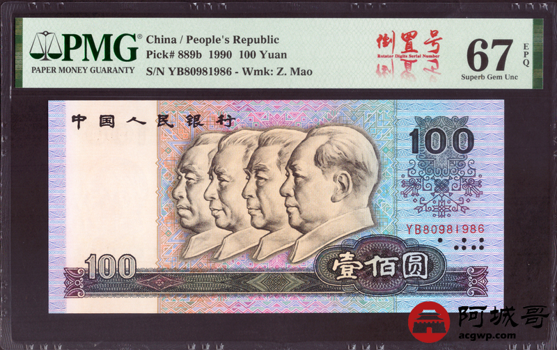 Lot:30 四版 1990年 中国人民银行壹佰圆 PMG 67EPQ 倒置号