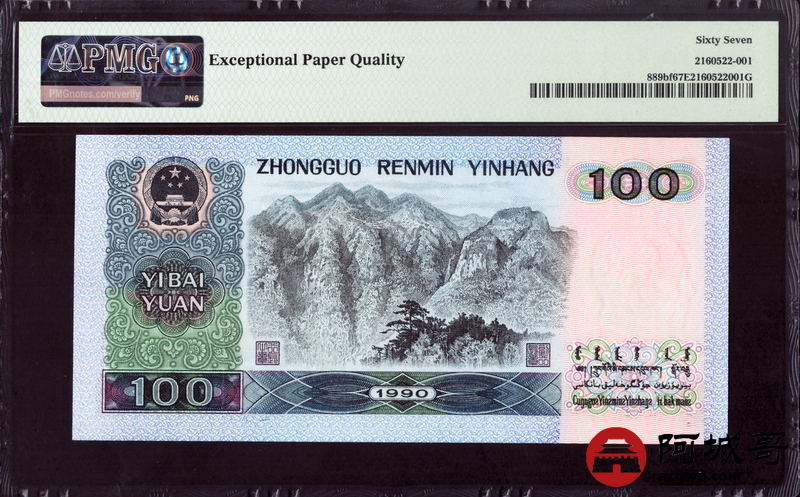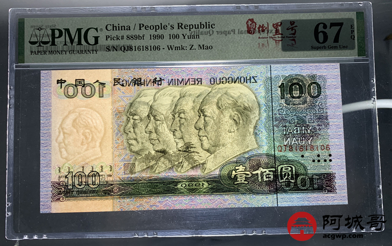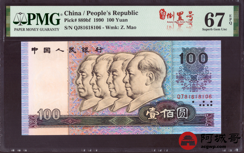 Lot:32 四版 1990年 中国人民银行壹佰圆 PMG 67EPQ 倒置号