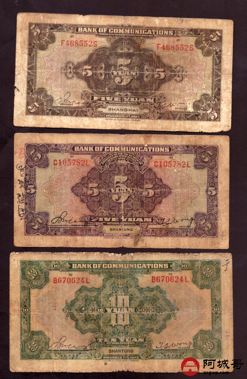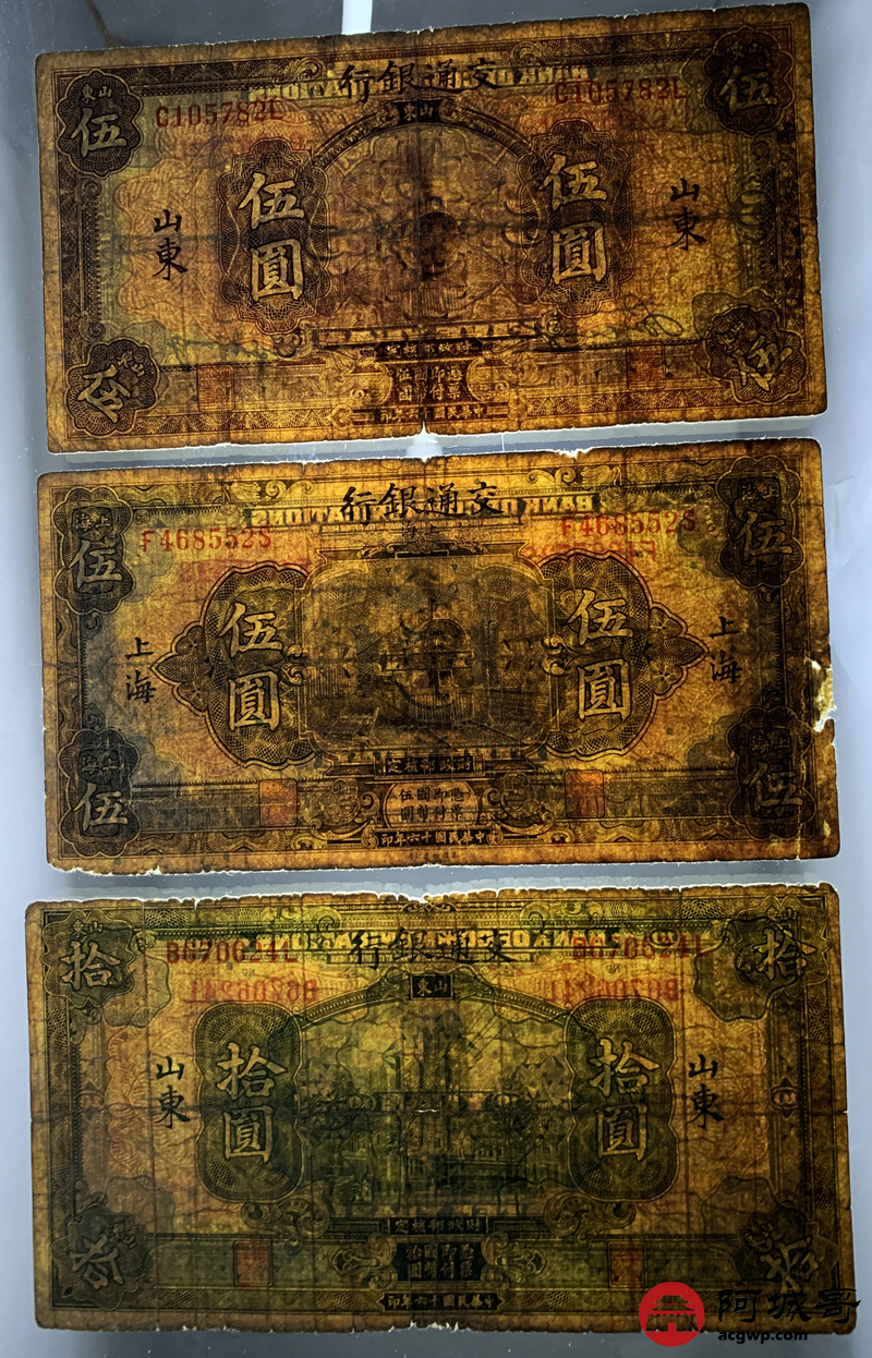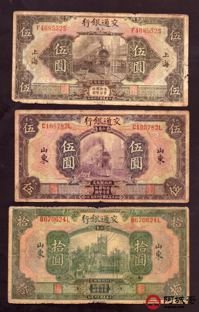 Lot:49 民国十六年 交通银行 拾圆 3张 67至68成新