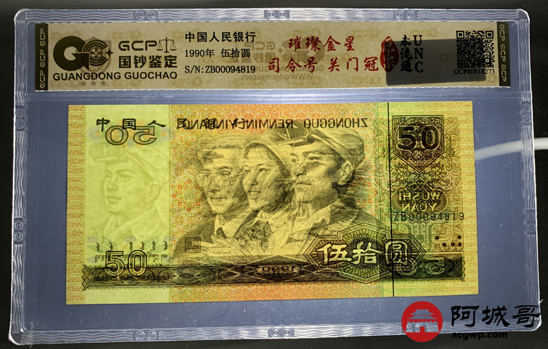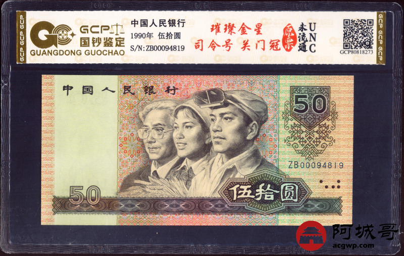 Lot:55 四版 1990年 中国人民银行50元 GCP UNC 司令号