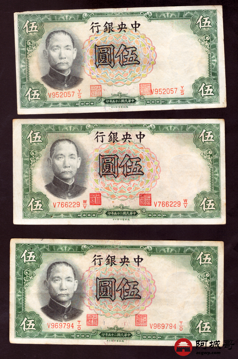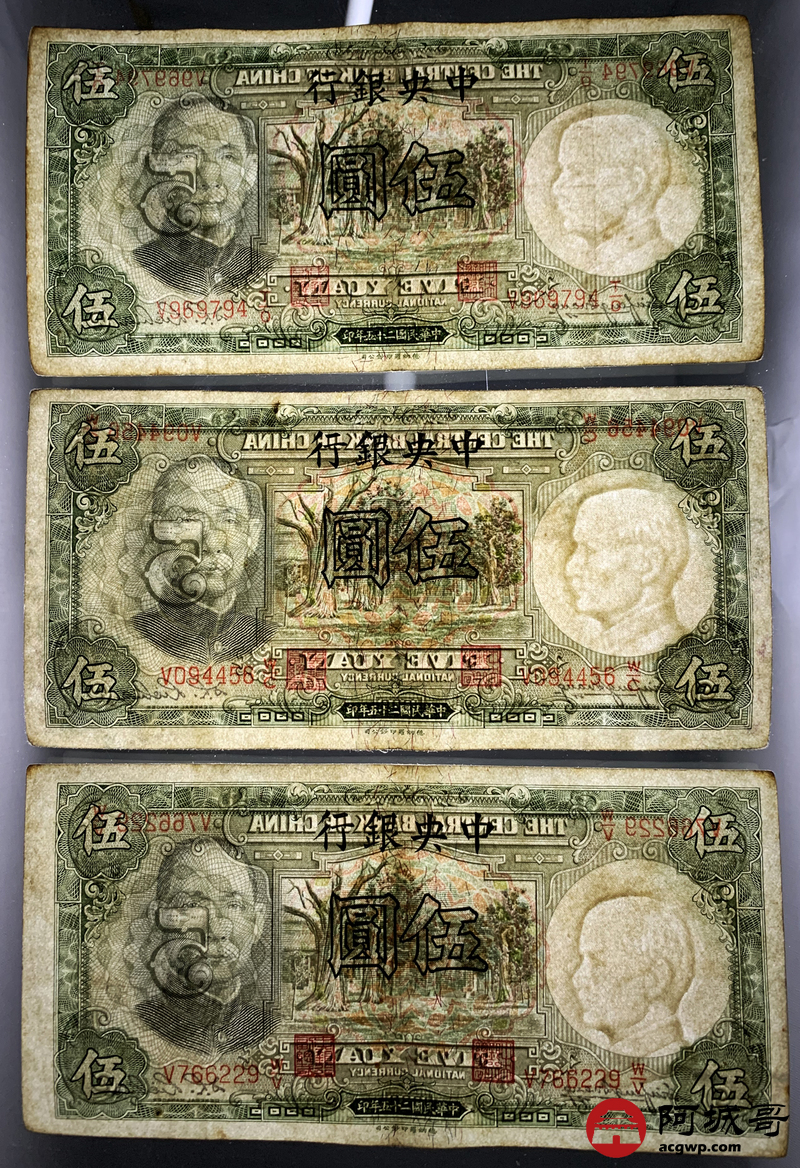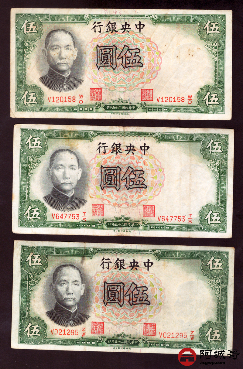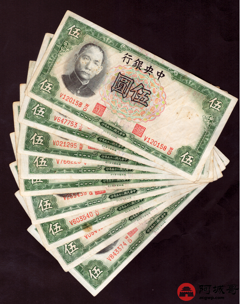 Lot:67 民国二十五年 中央银行伍圆 10张 7至73成新