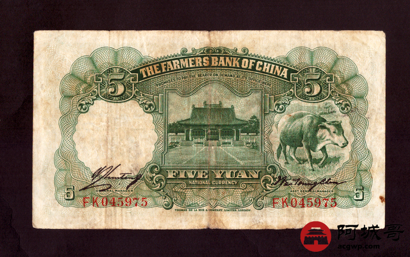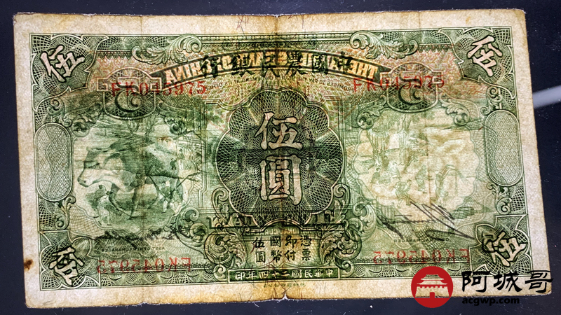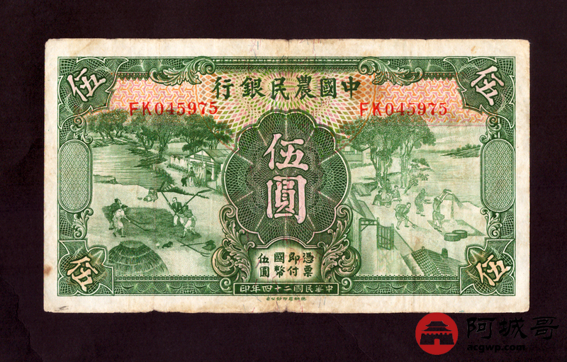 Lot:33 民国二十四年 中国农民银行 伍圆 69成新