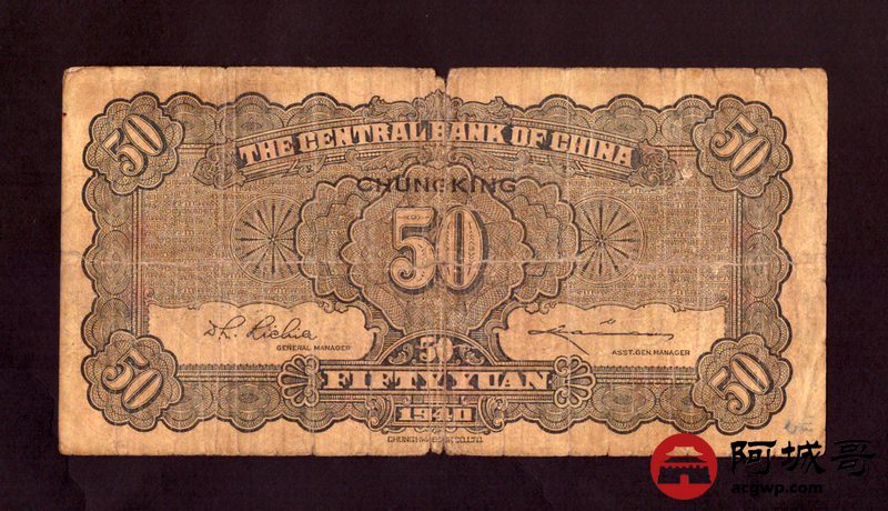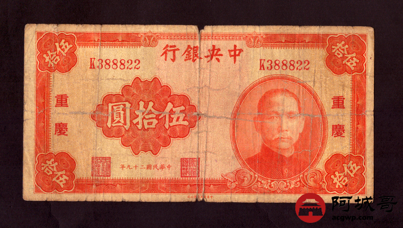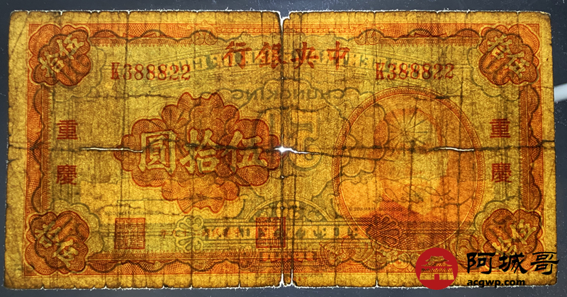 Lot:43 民国二十九年 中央银行 伍拾圆 重庆地名 66成新