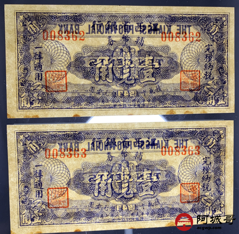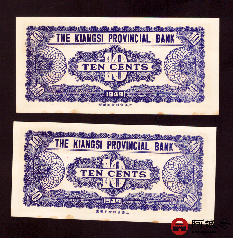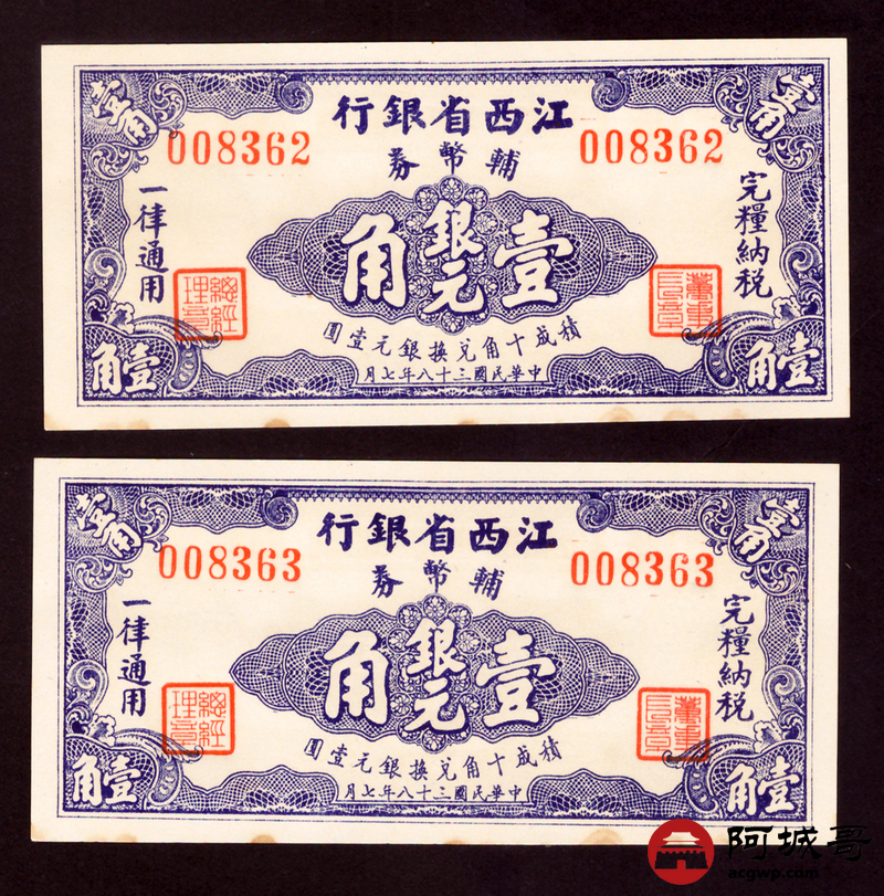Lot:50 民国三十八年 江西省银行 辅币券 壹角 两张 97至全新