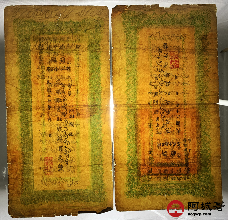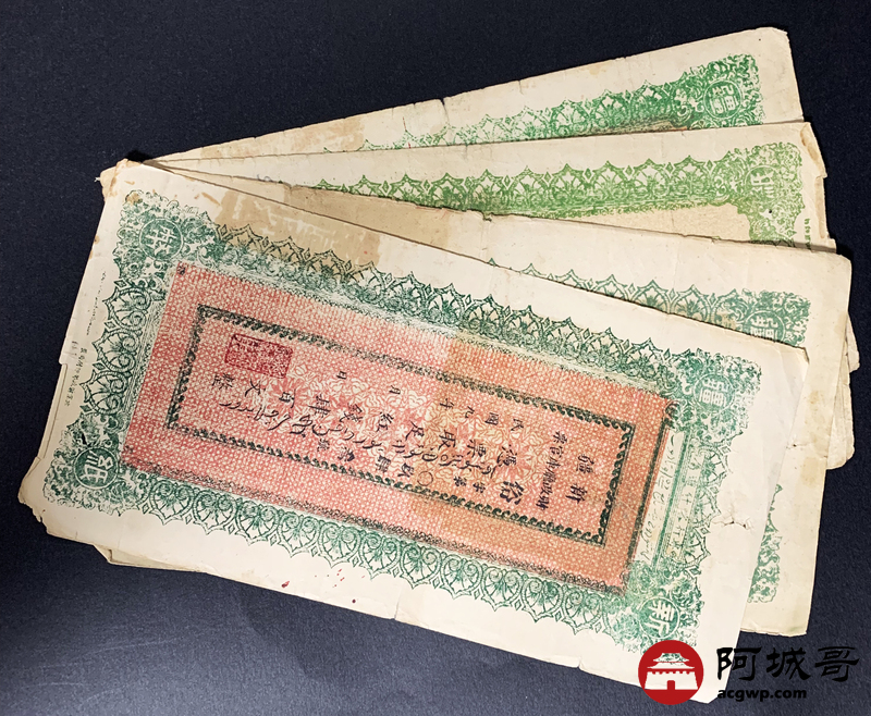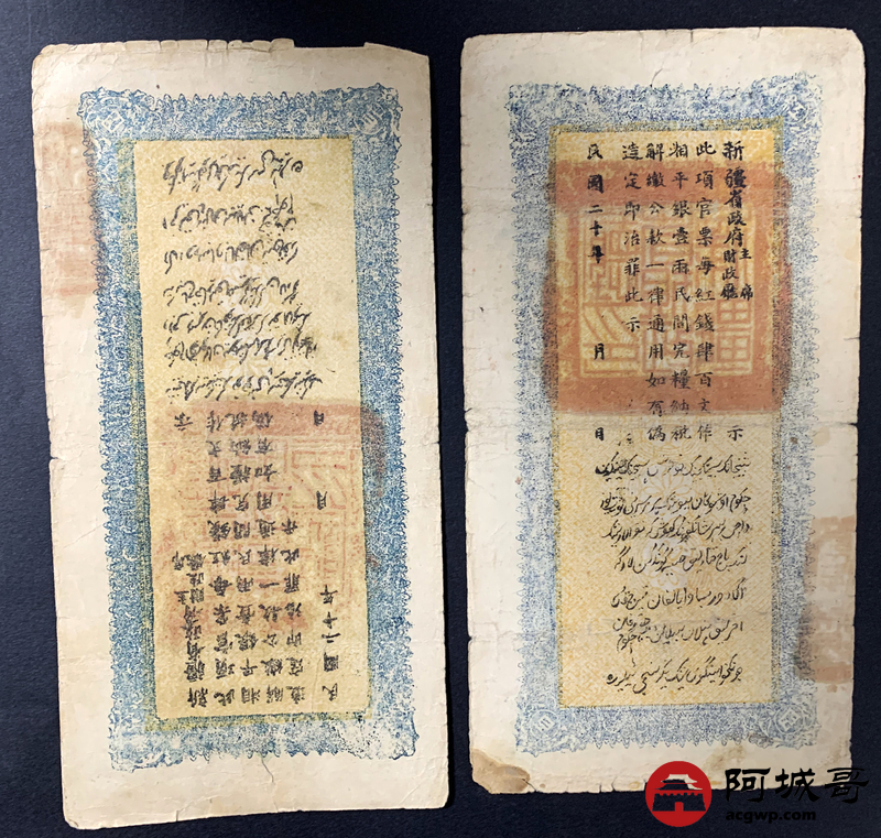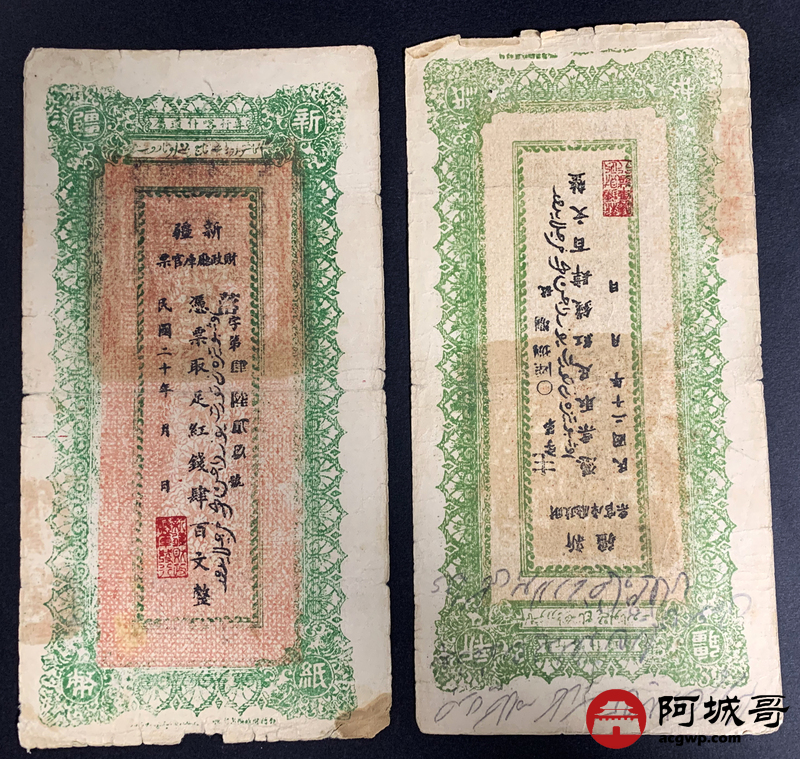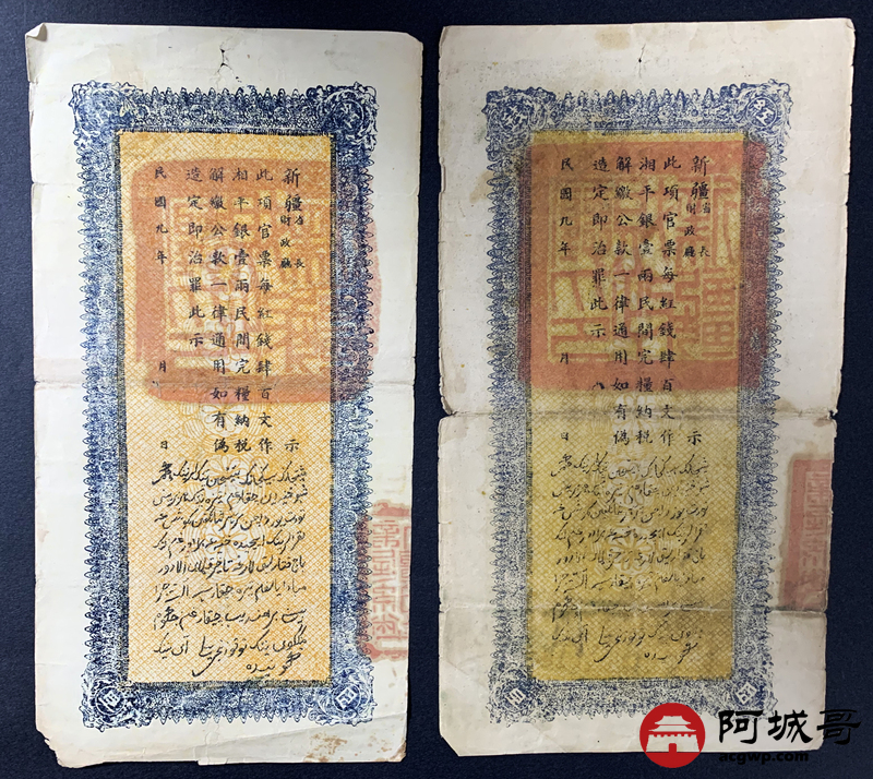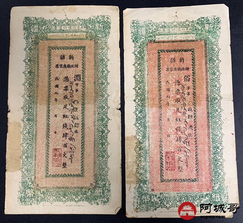 Lot:36 民国九年、二十年 新疆财政厅库官票 红钱肆佰文整 四张 67成新
