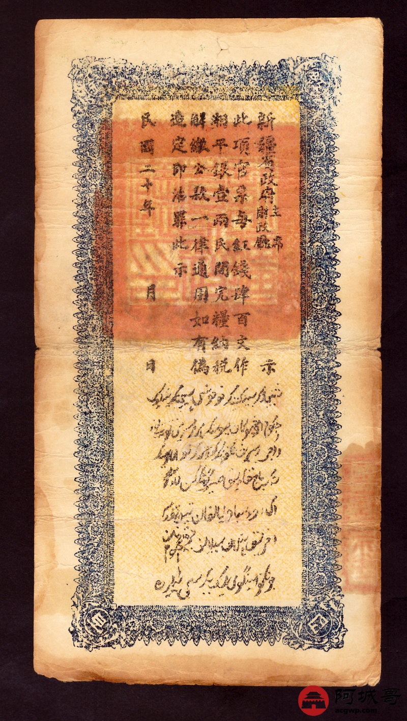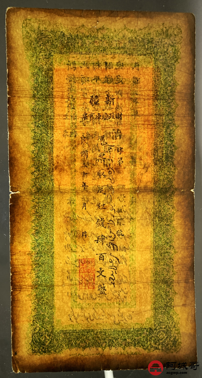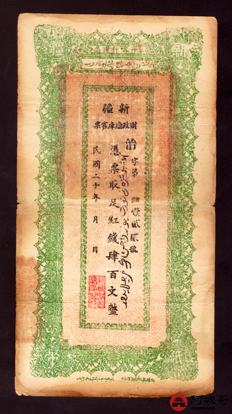 Lot:52 民国20年 新疆财政厅库官票 红钱肆佰文整 68成新