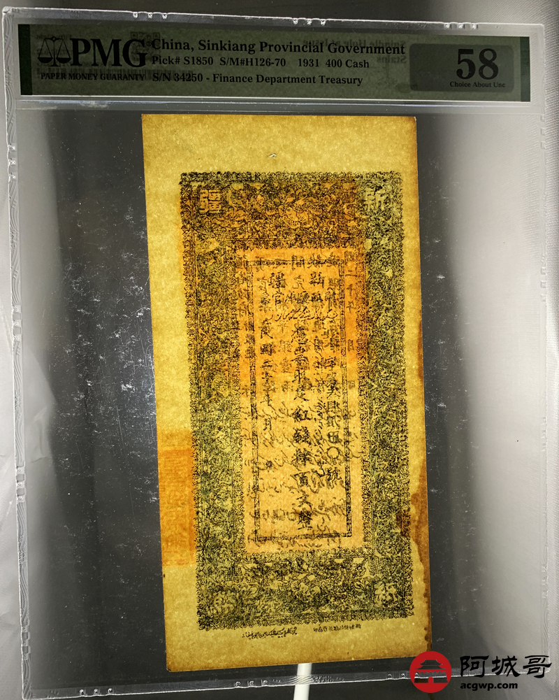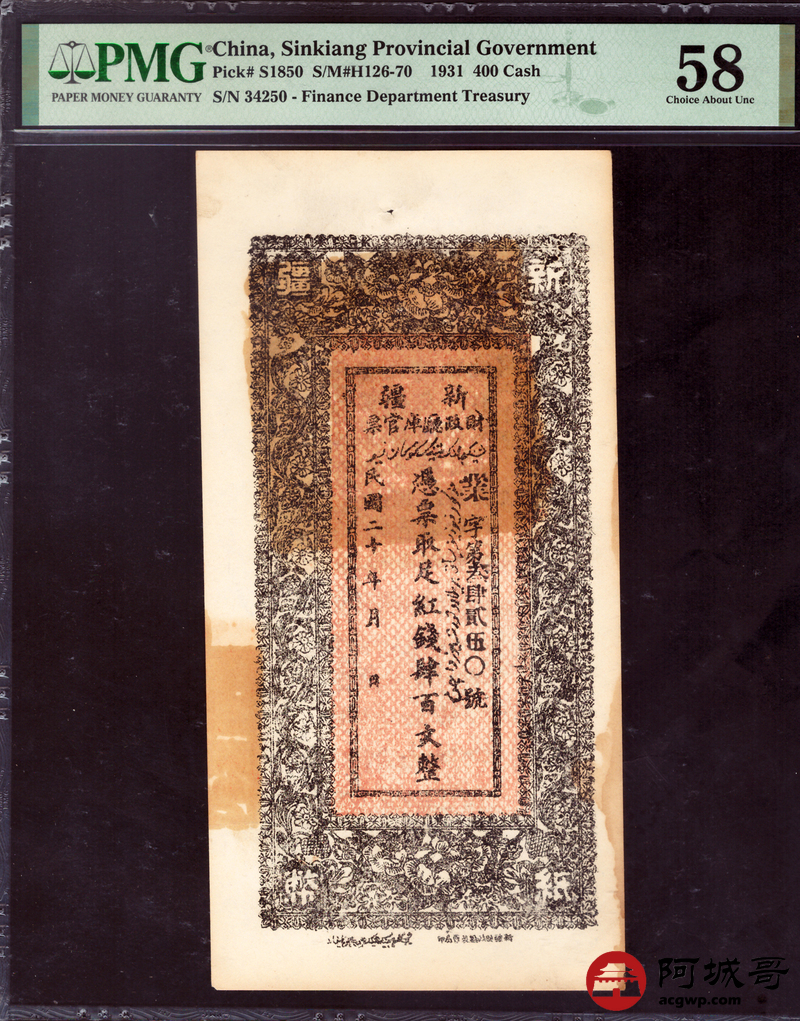 Lot:28 民国20年 新疆财政厅库官票 红钱肆佰文整 PMG58