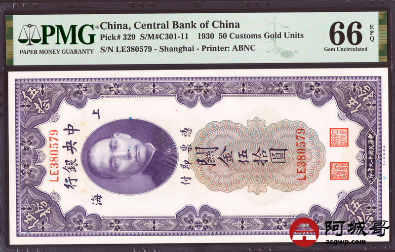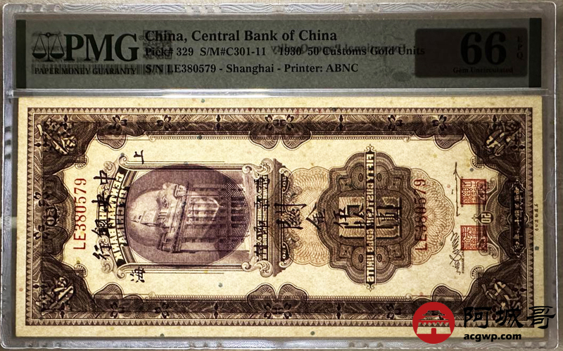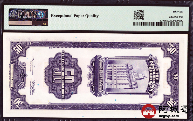 Lot:45 民国19年 中央银行 关金伍拾圆 PMG 66EPQ 好号无4
