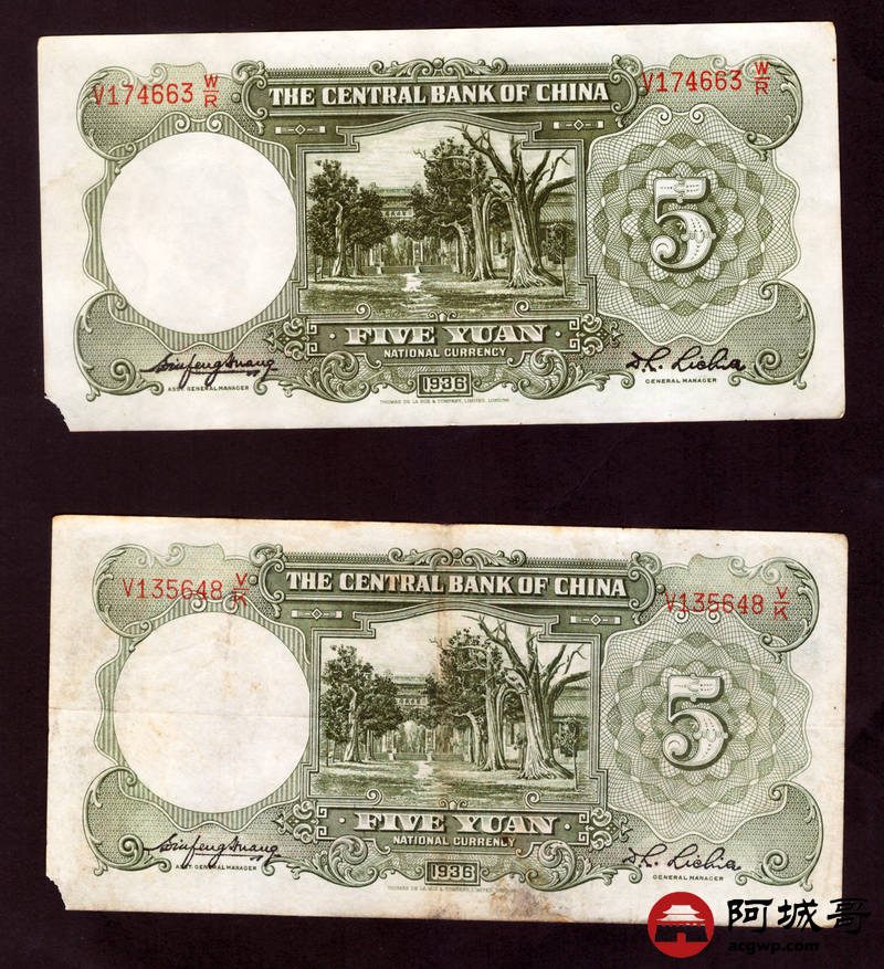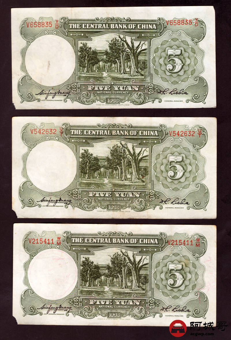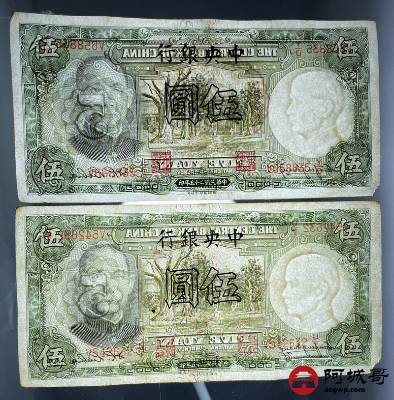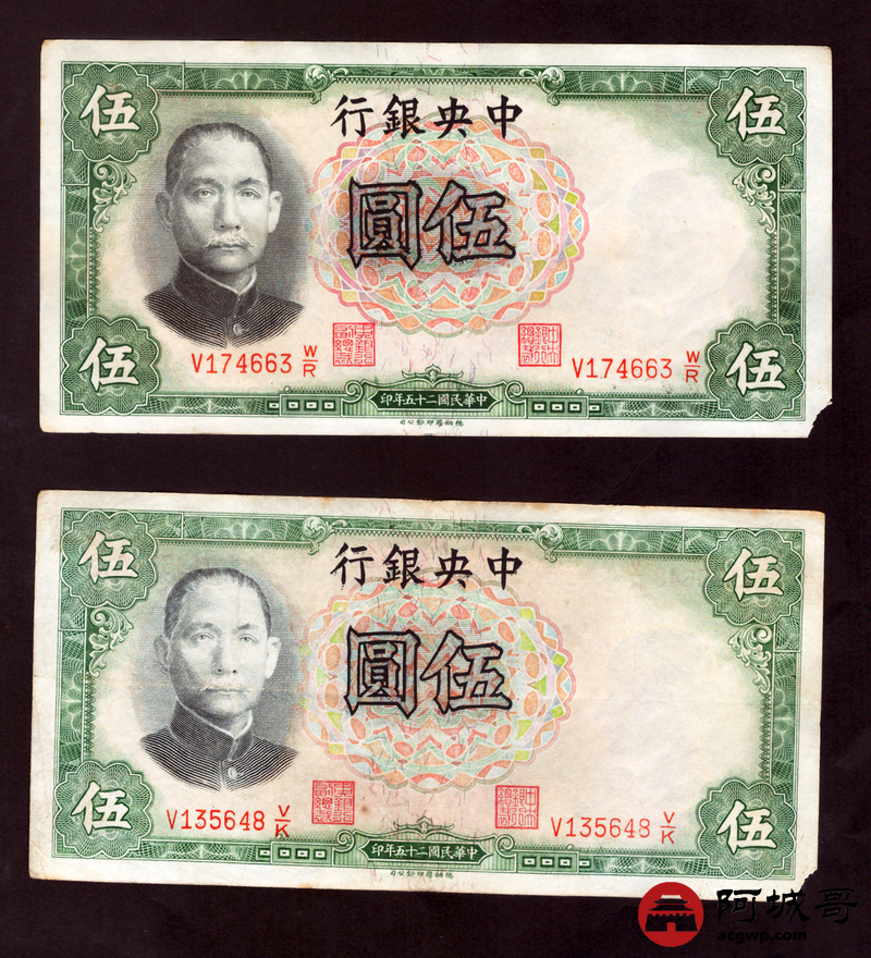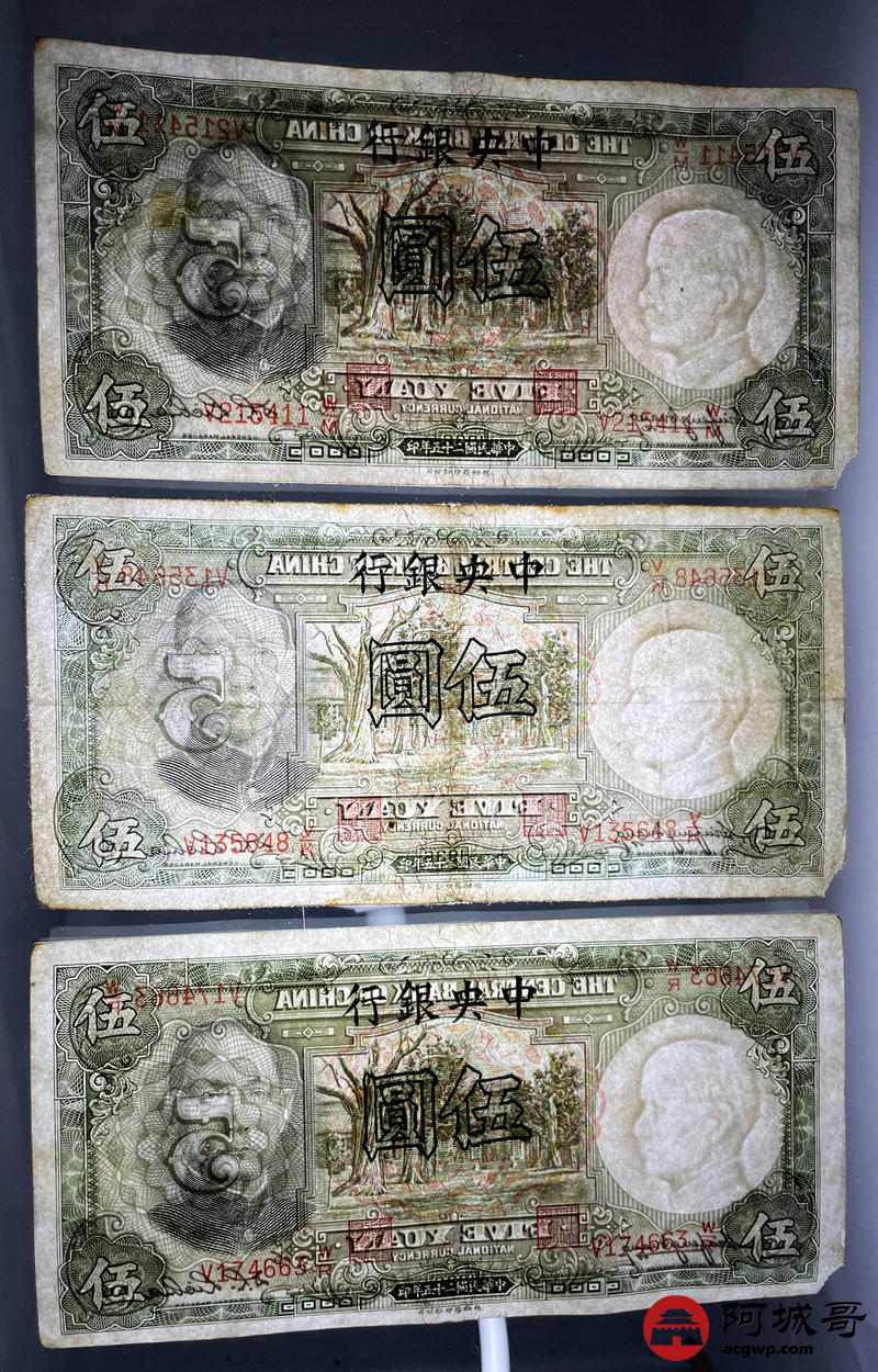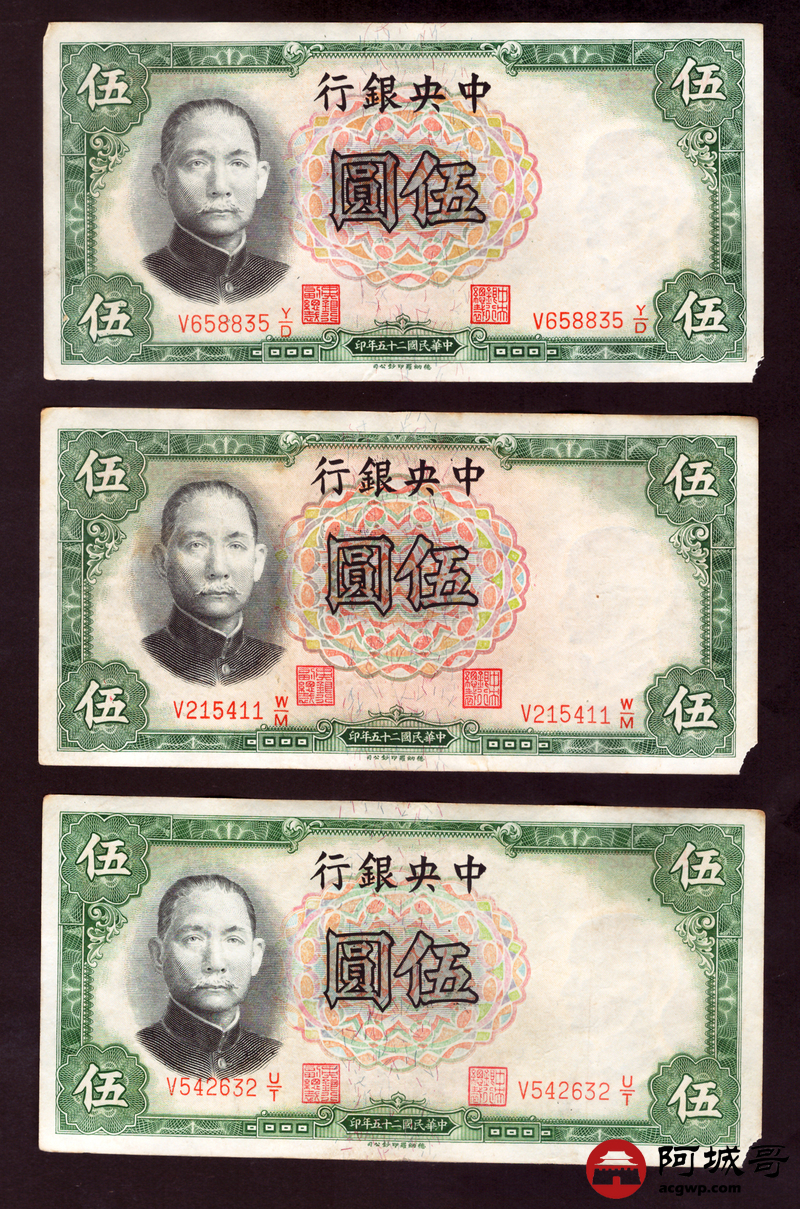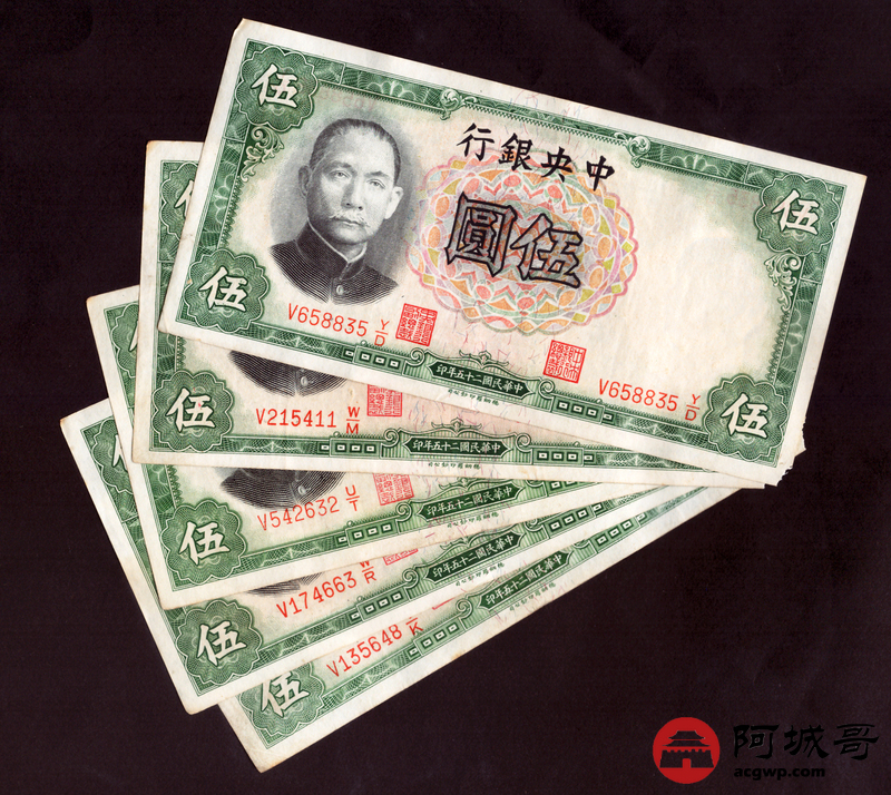 Lot:14 民国二十五年 中央银行 伍圆 5张 68成新