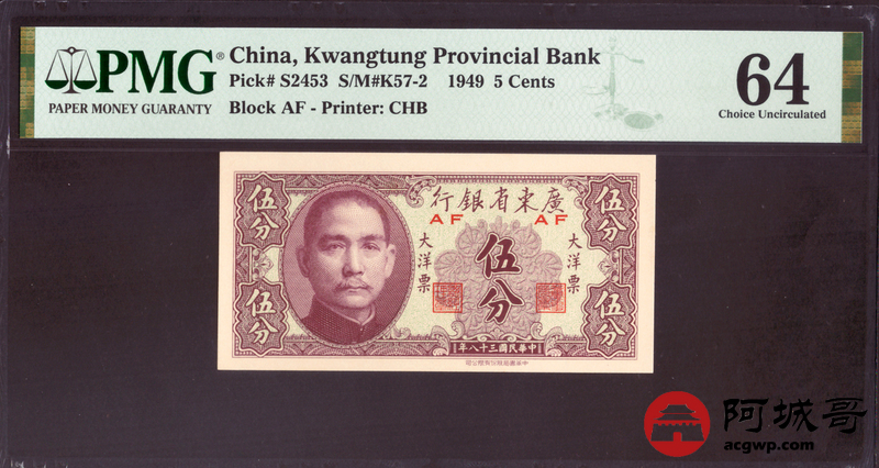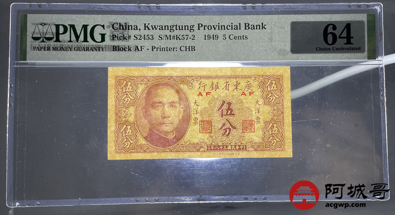 Lot:35 民国三十八年 广东省银行 伍分 PMG 64