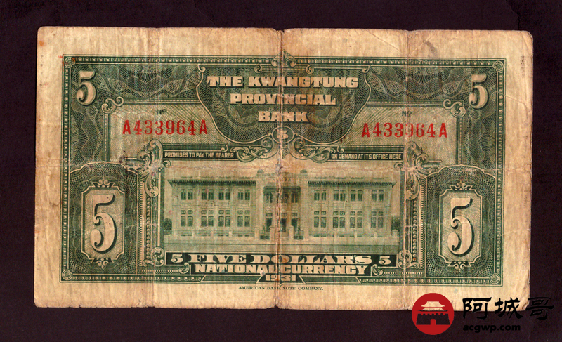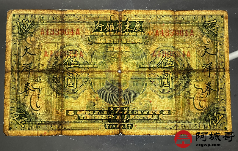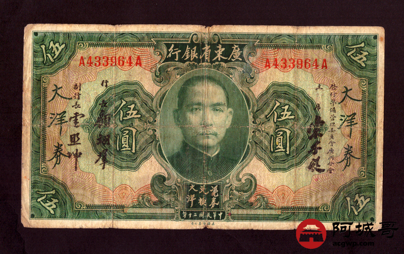 Lot:64 民国二十年 广东省银行 大洋券伍圆 55成新