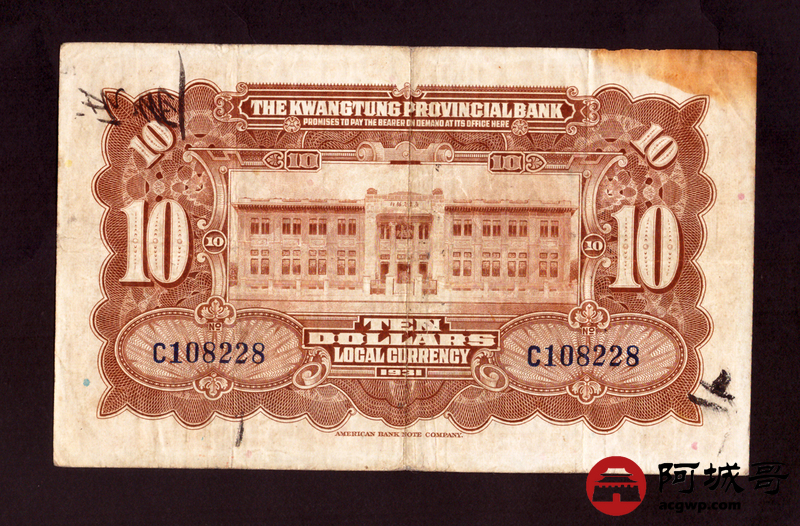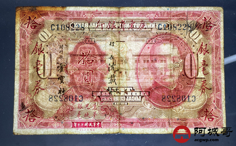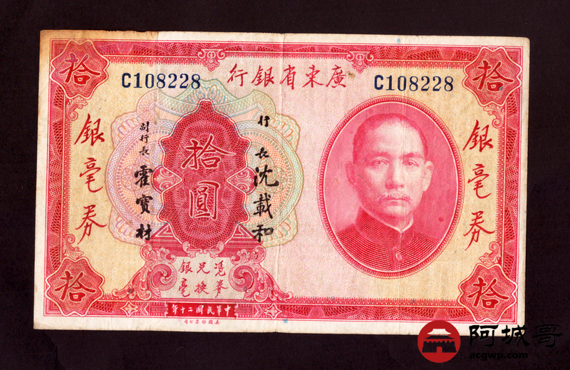 Lot:60 民国二十年 广东省银行 银毫券拾圆 约72成新