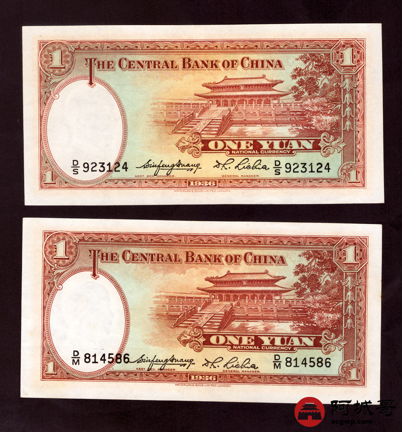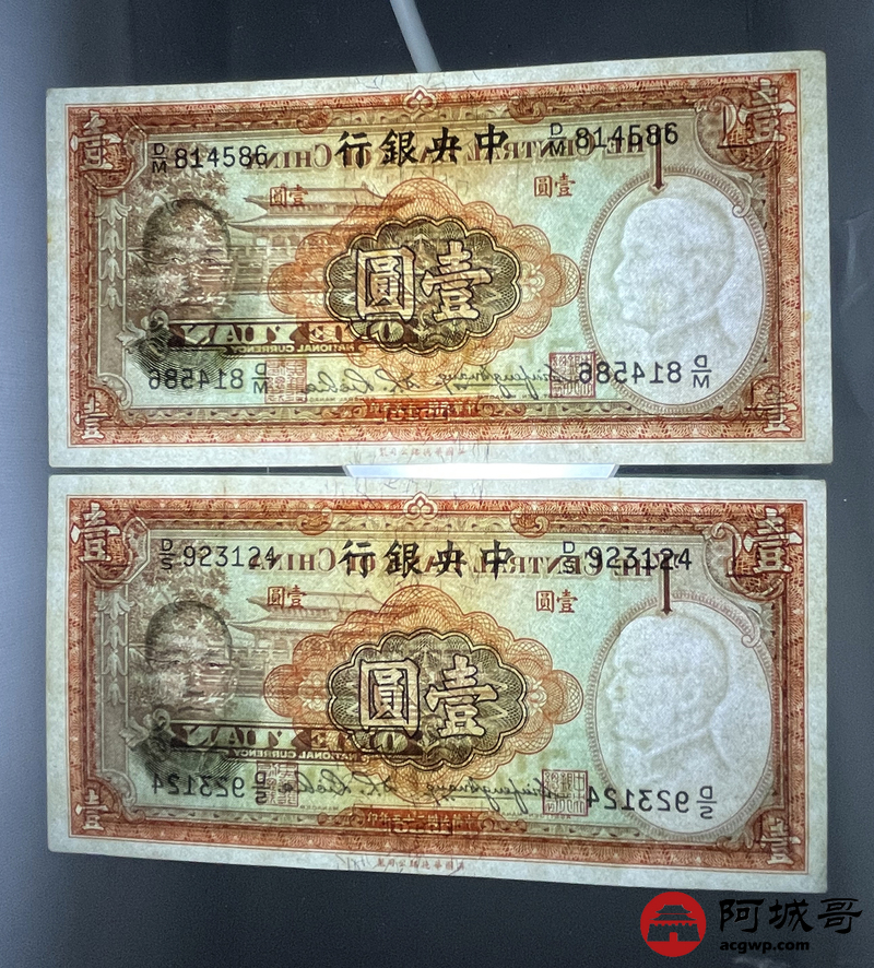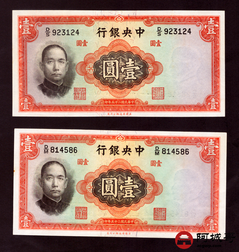 Lot:46 民国二十五年 中央银行 壹圆 2张 9至94成新