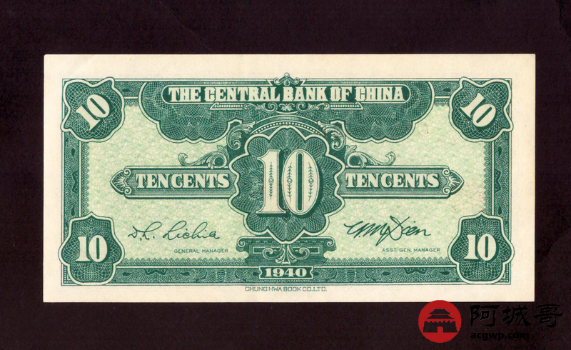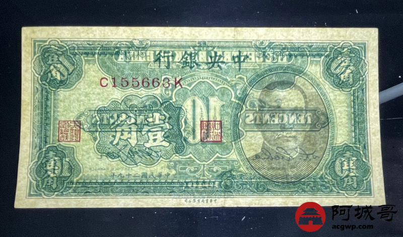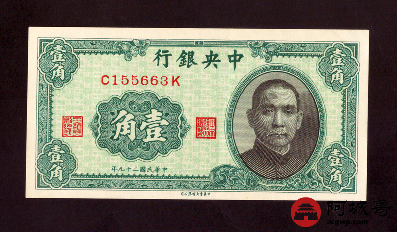 Lot:72 民国二十九年 中央银行 壹角 软折9至92成新