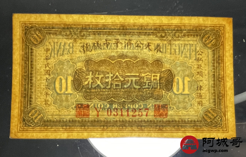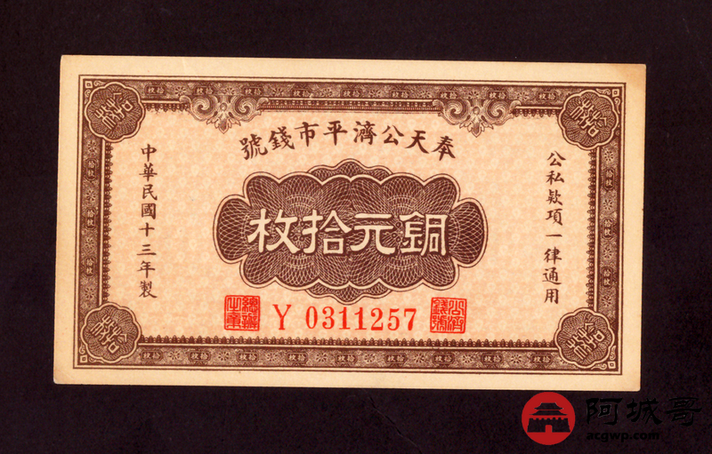 Lot:30 民国十三年 奉天公济平市钱号 铜元拾枚 93至95成新