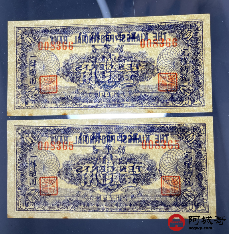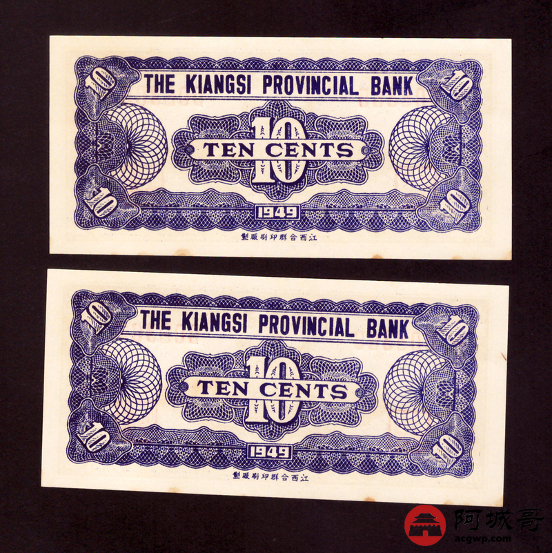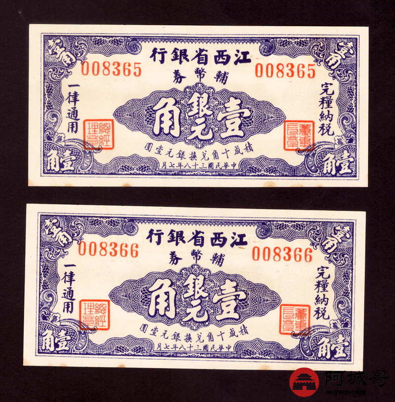 Lot:49 民国三十八年 江西省银行 辅币券 壹角 2张 96至全新