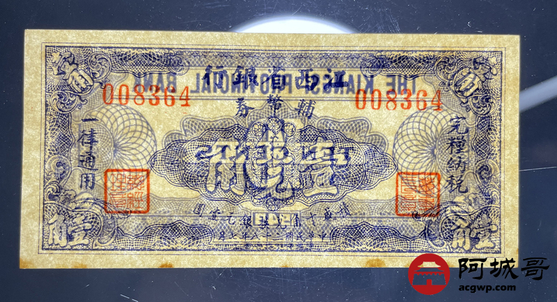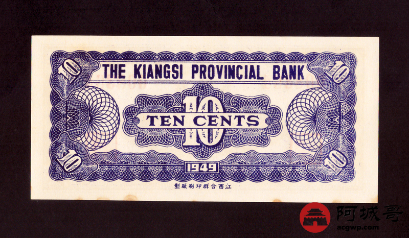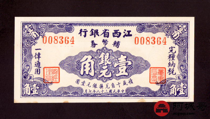 Lot:7 民国三十八年 江西省银行 辅币券 壹角 96至全新