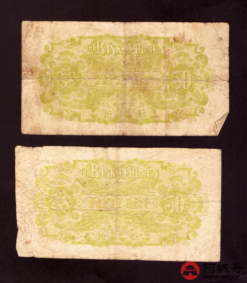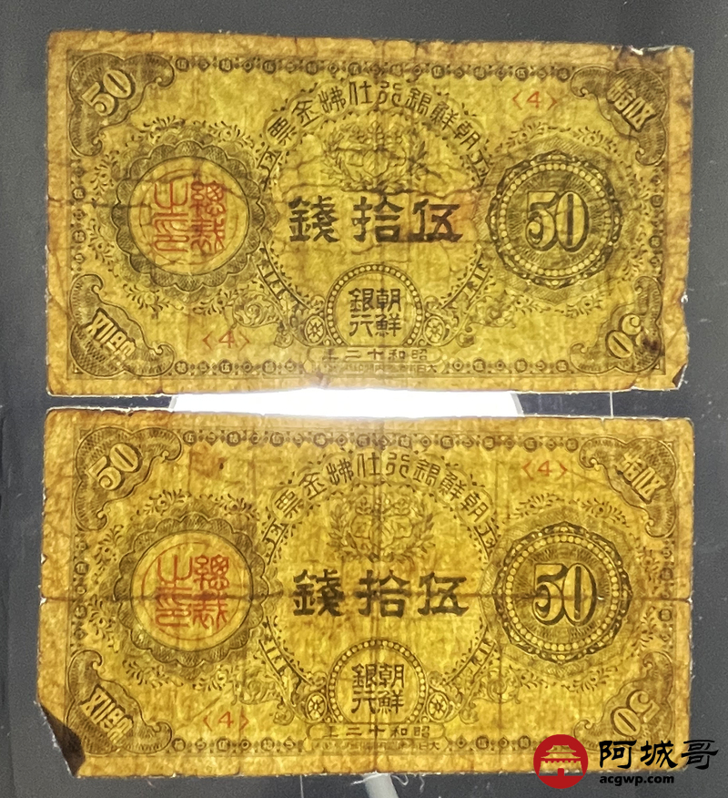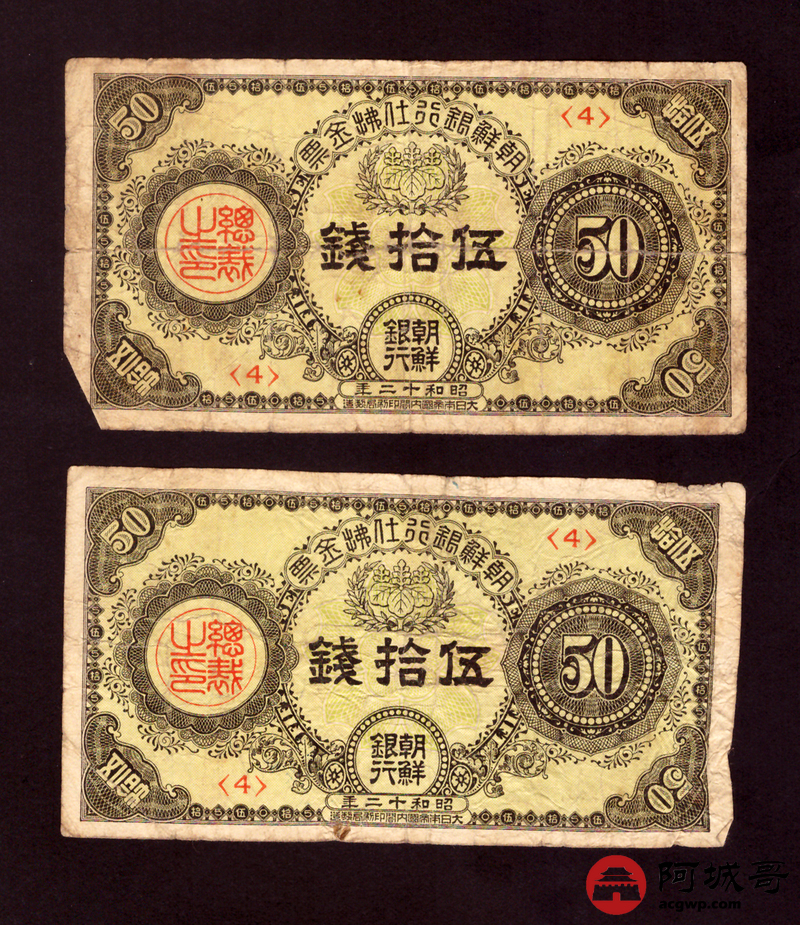 Lot:22 昭和十二年 朝鲜银行仕拂金票 伍拾钱 2张 69成新