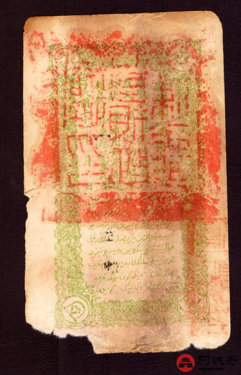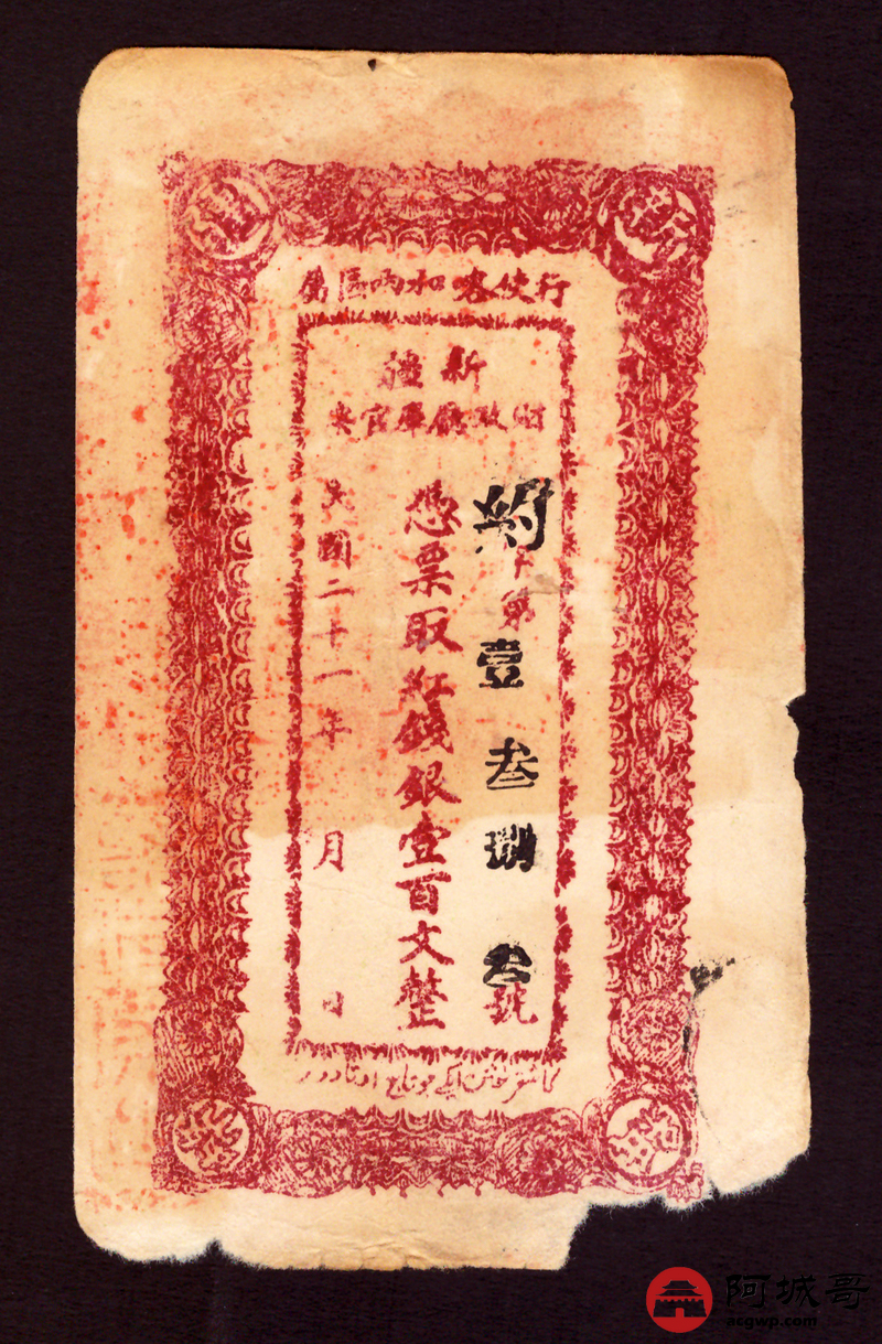 Lot:2 民国21年 新疆财政厅库官票行使喀和两区 壹佰文整 65成新