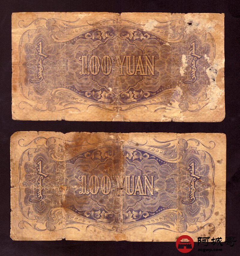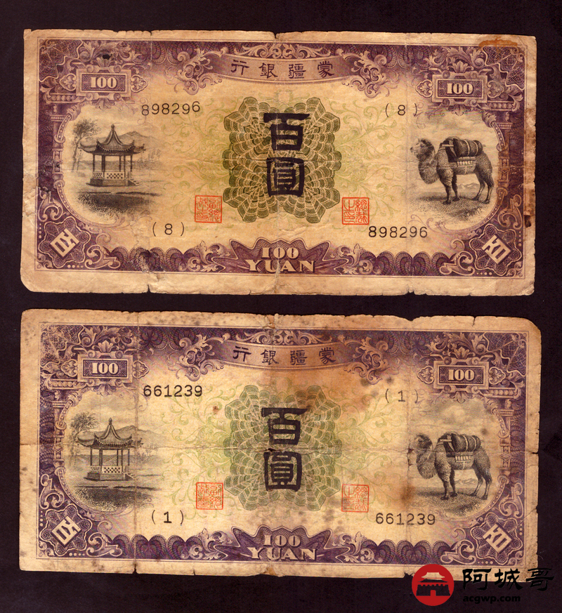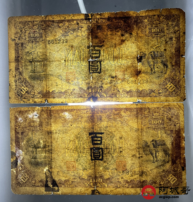 Lot:39 蒙疆银行 百圆 2张 55成新 有修补