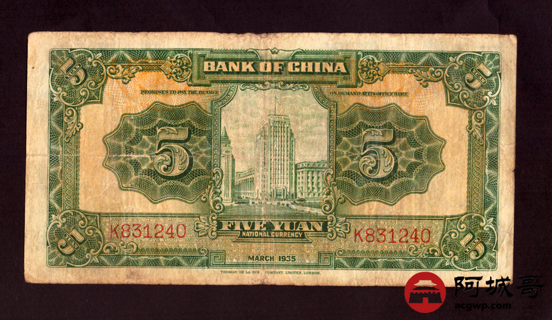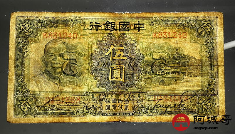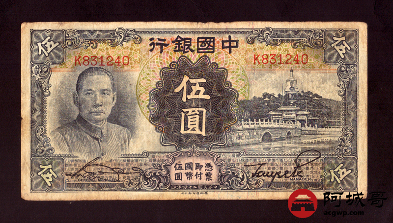 Lot:57 民国二十四年 中国银行 伍圆 69成新