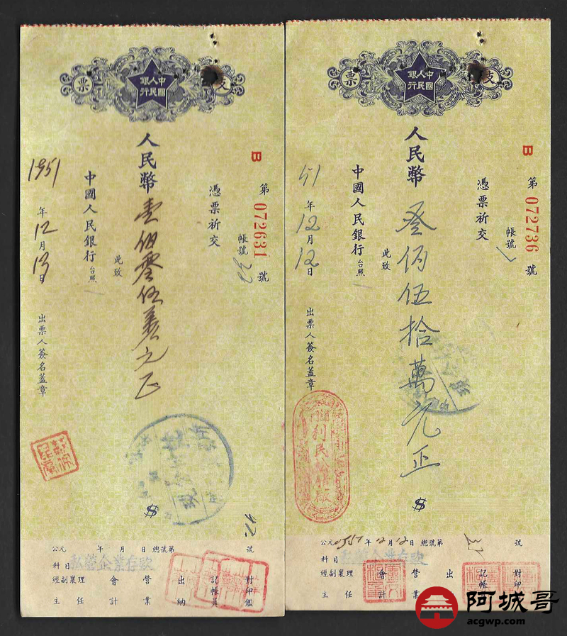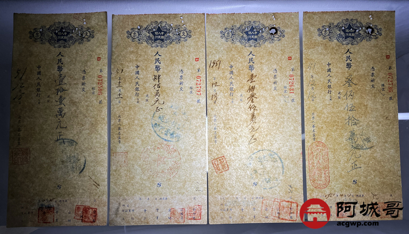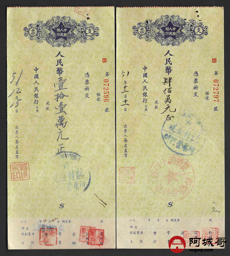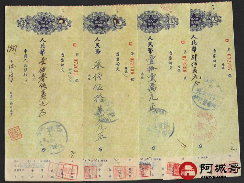 Lot:38 1951年 中国人民银行 各种面值支票 4张