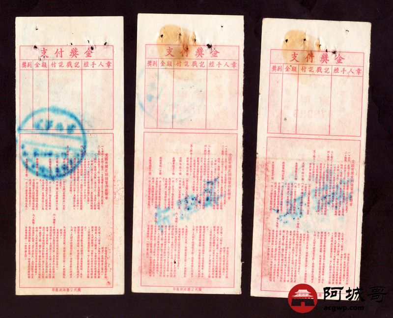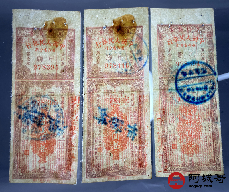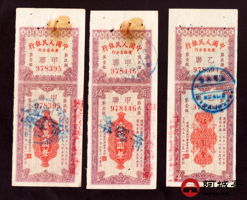 Lot:23 1952年 中国人民银行 广西省分行 爱国有奖定期储蓄存单 各种面值3张