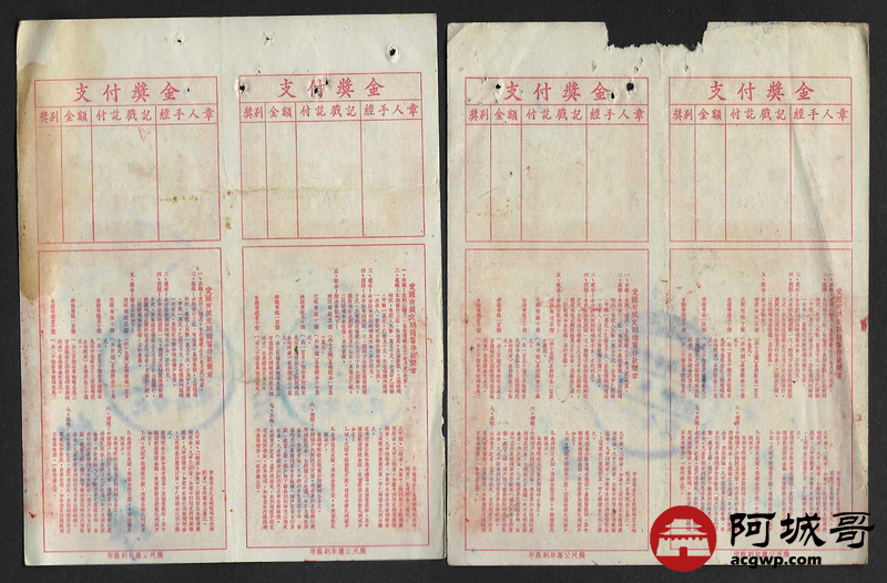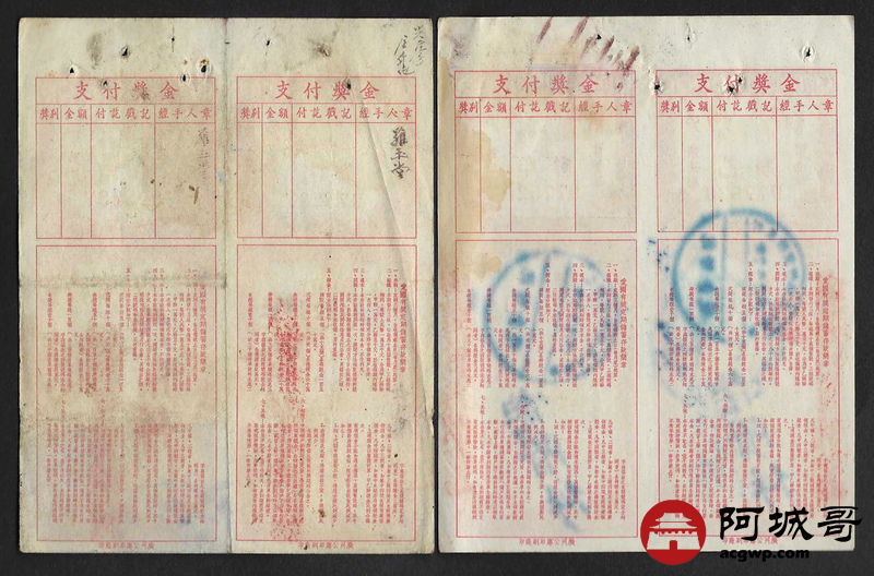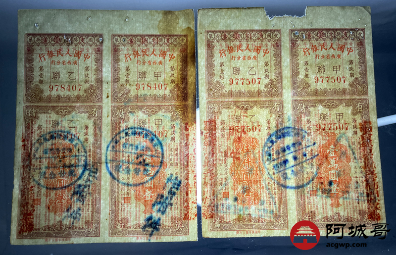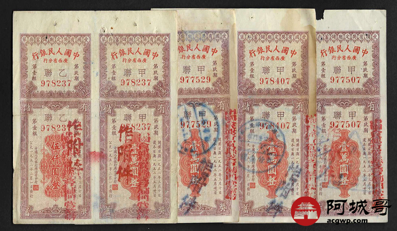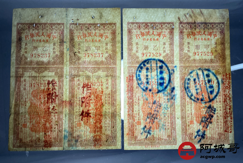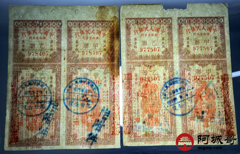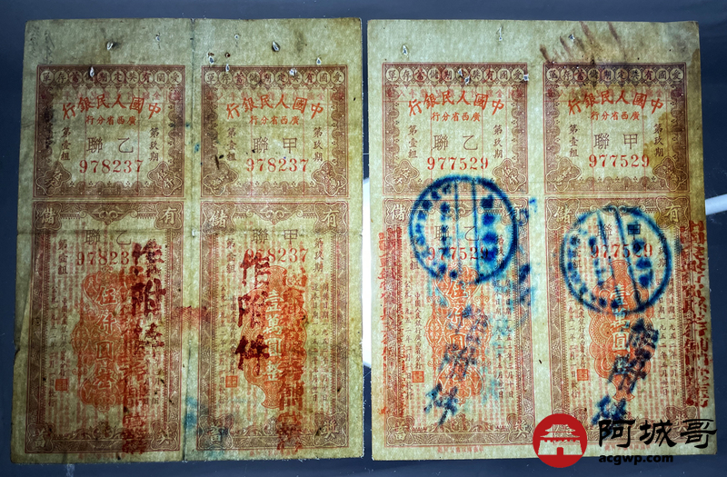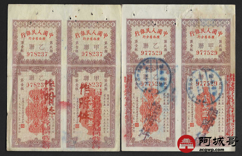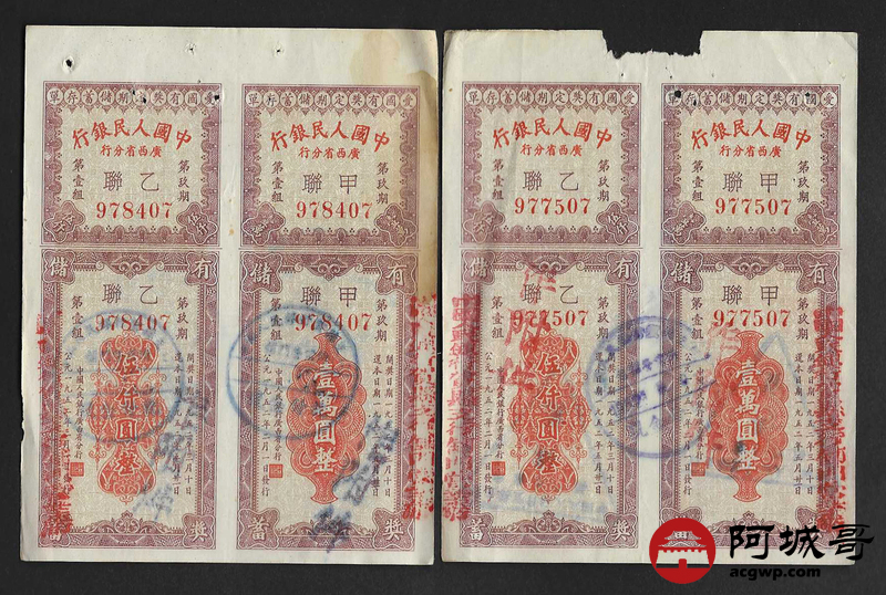 Lot:56 1952年 中国人民银行 广西省分行 爱国有奖定期储蓄存单 4张