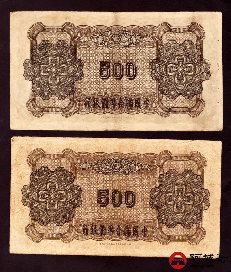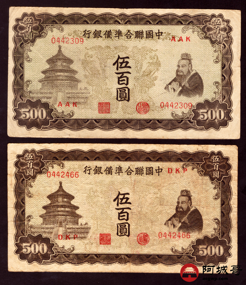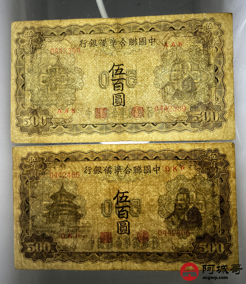 Lot:45 中国联合准备银行 伍佰圆 2张 细孔7至72成新