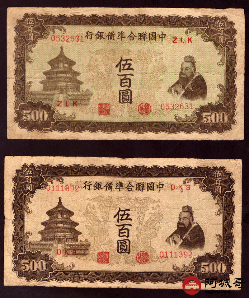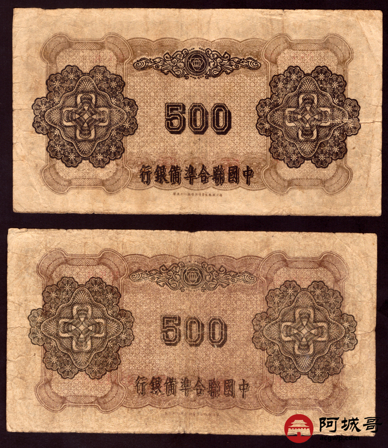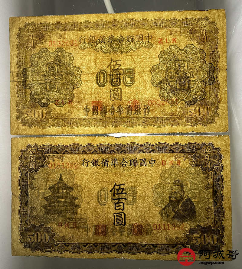 Lot:19 中国联合准备银行 伍佰圆 2张 69至7成新