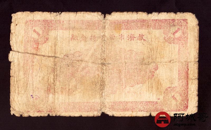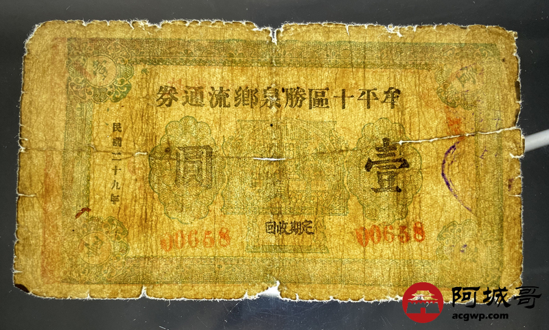Lot:45 民国二十九年 牟平十区胜泉乡流通券 壹圆 56成新