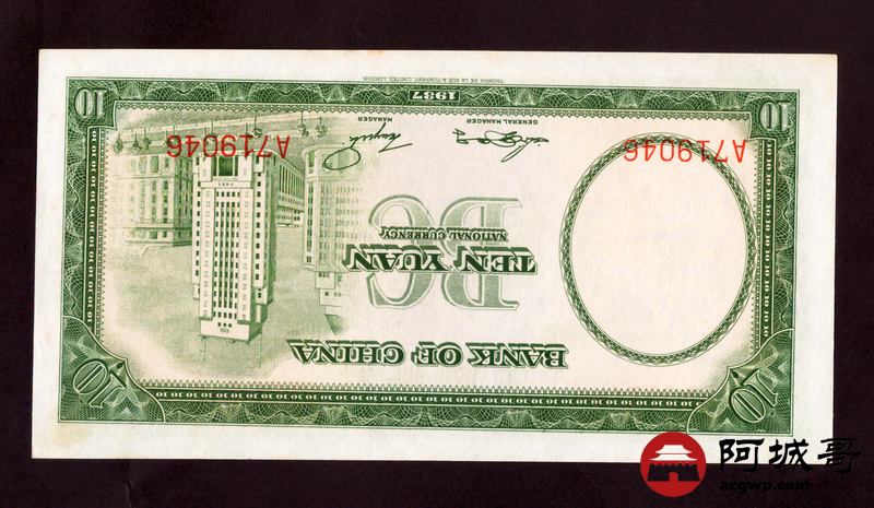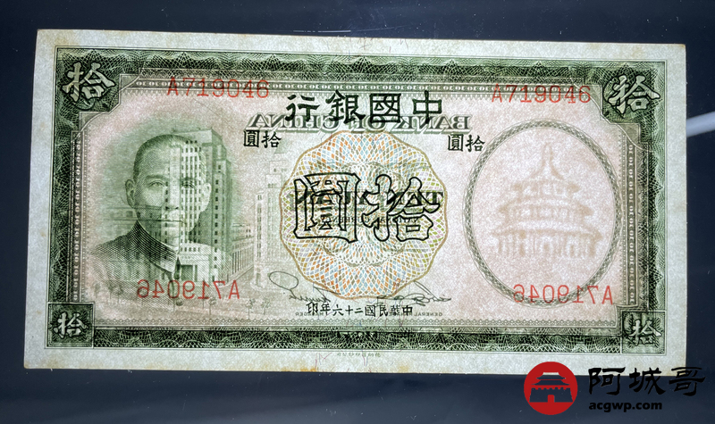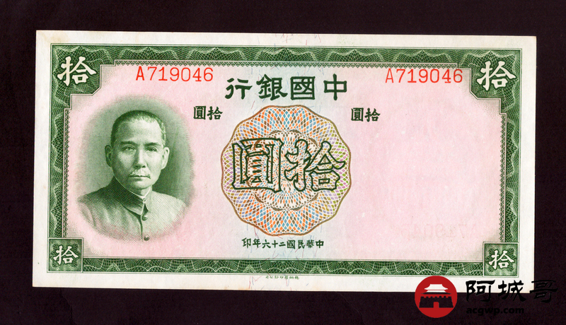 Lot:37 民国二十六年 中国银行 拾圆 原票94成新