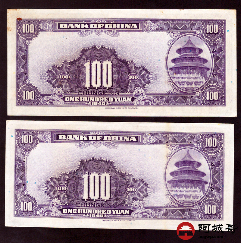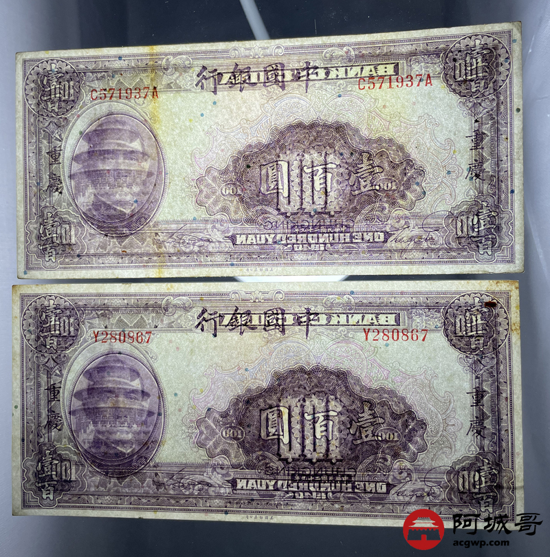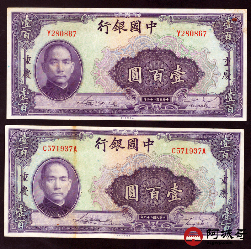 Lot:27 民国二十九年 中国银行 壹佰圆 重庆地名 2张 85至9成新