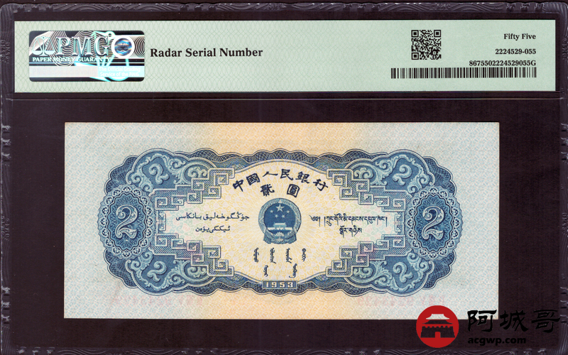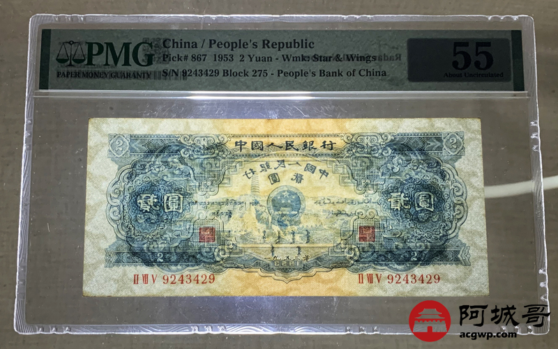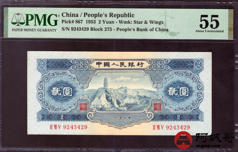 Lot:13 二版 1953年 宝塔山贰圆 PMG 55 雷达号