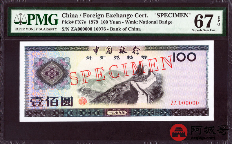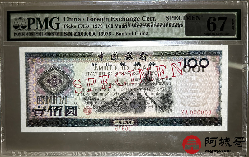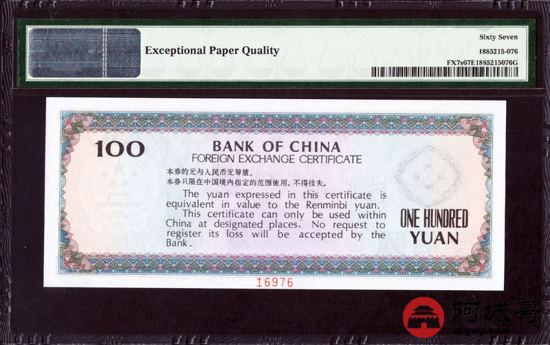 Lot:63 1979年 中国银行外汇兑换券 100元 PMG 67EPQ
