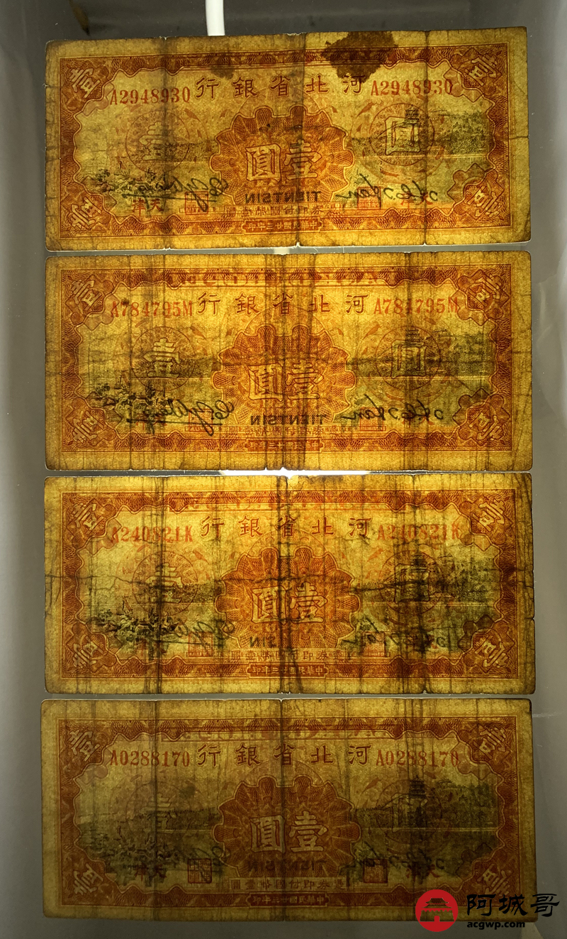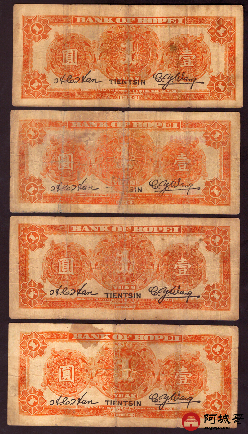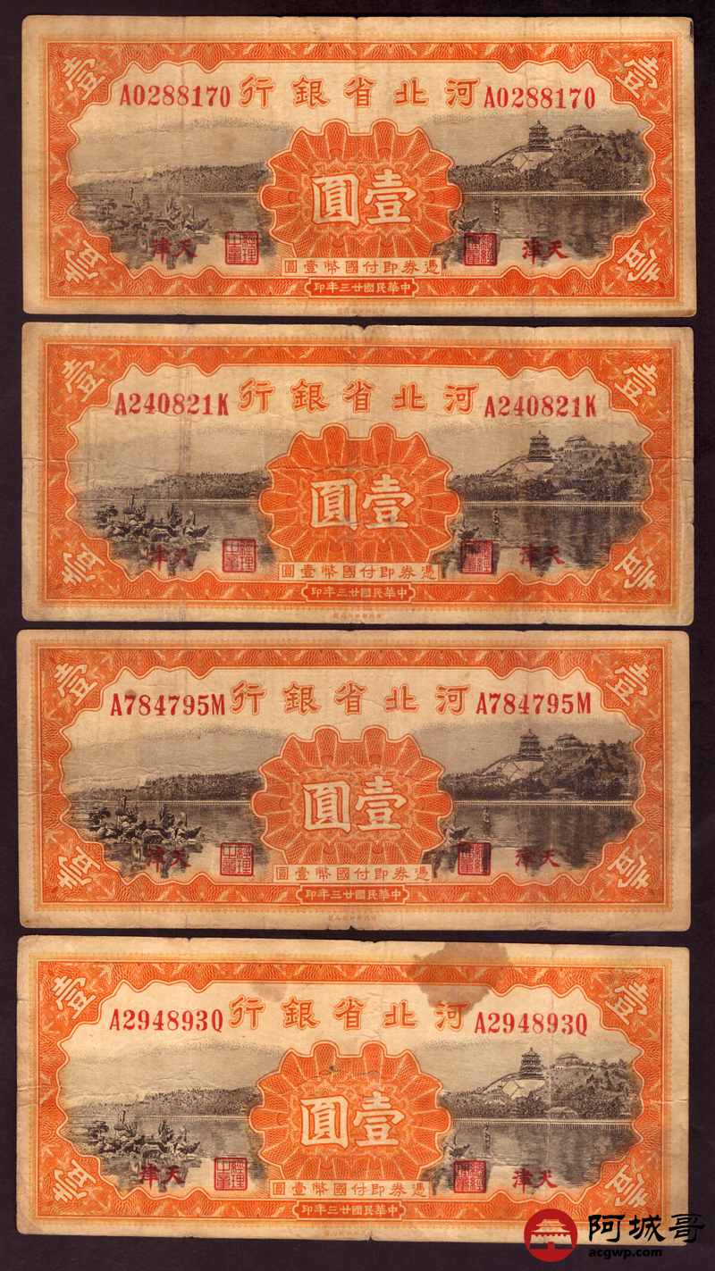 Lot:1 民国二十三年 河北省银行 壹圆 4张 68至69成新