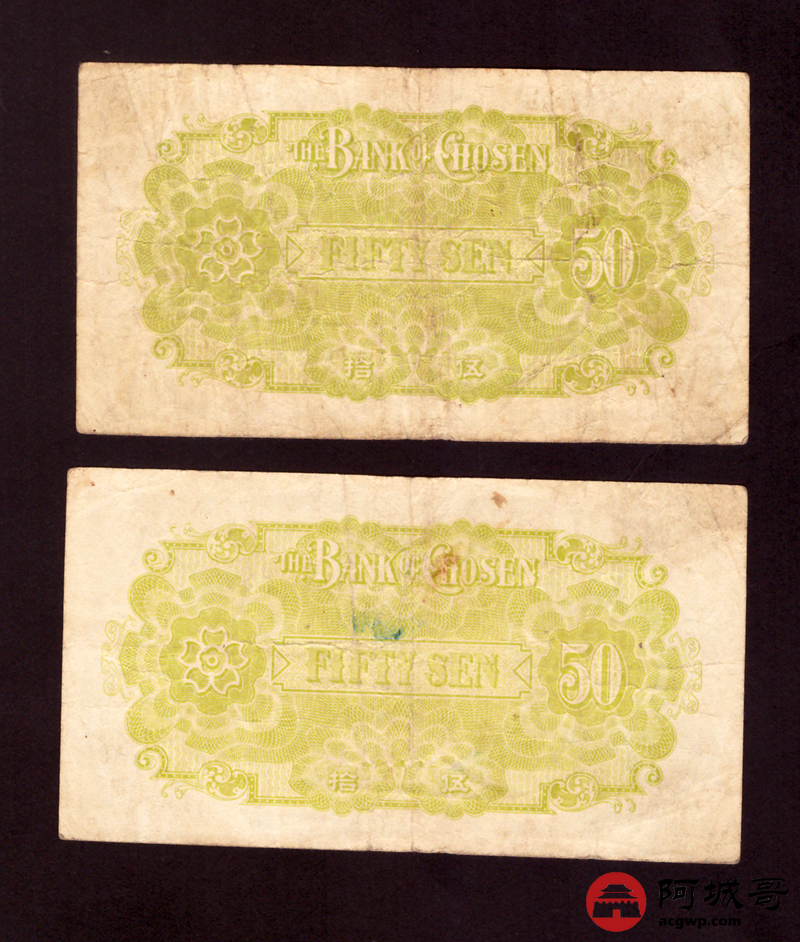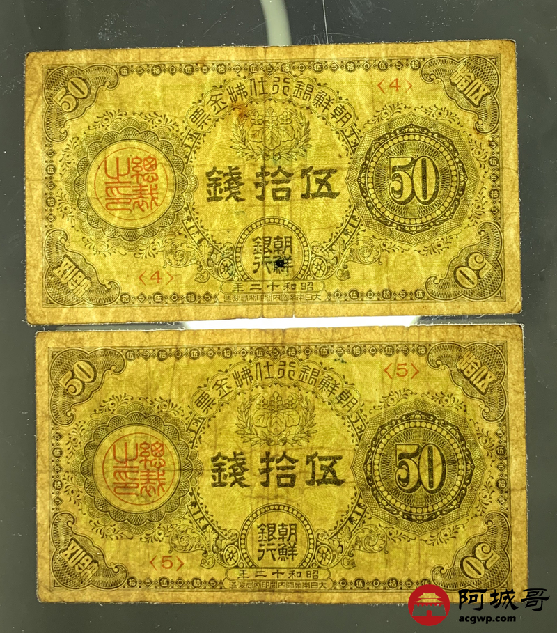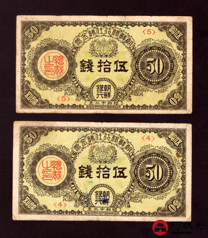 Lot:30 朝鲜银行仕拂金票 伍拾钱 2张 7至72成新