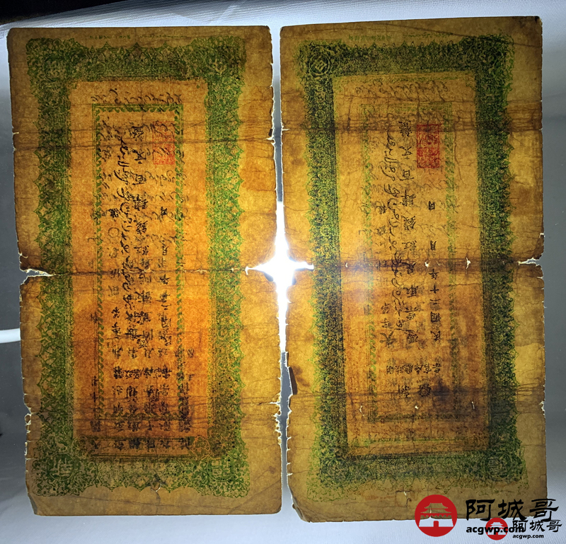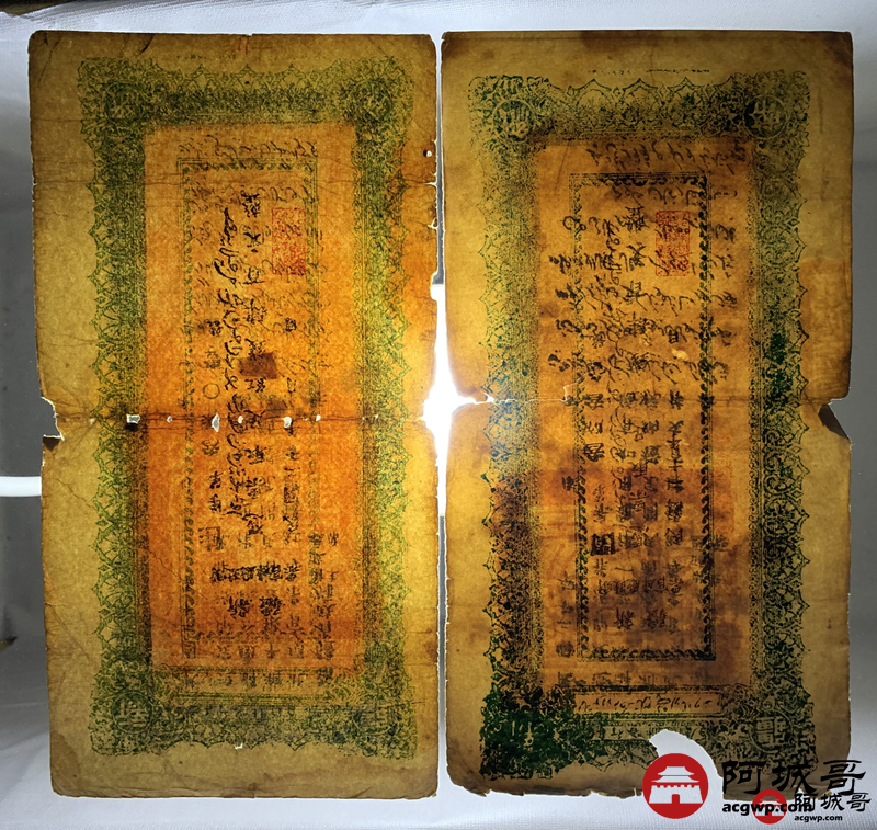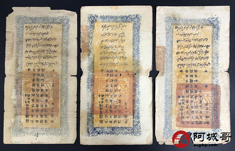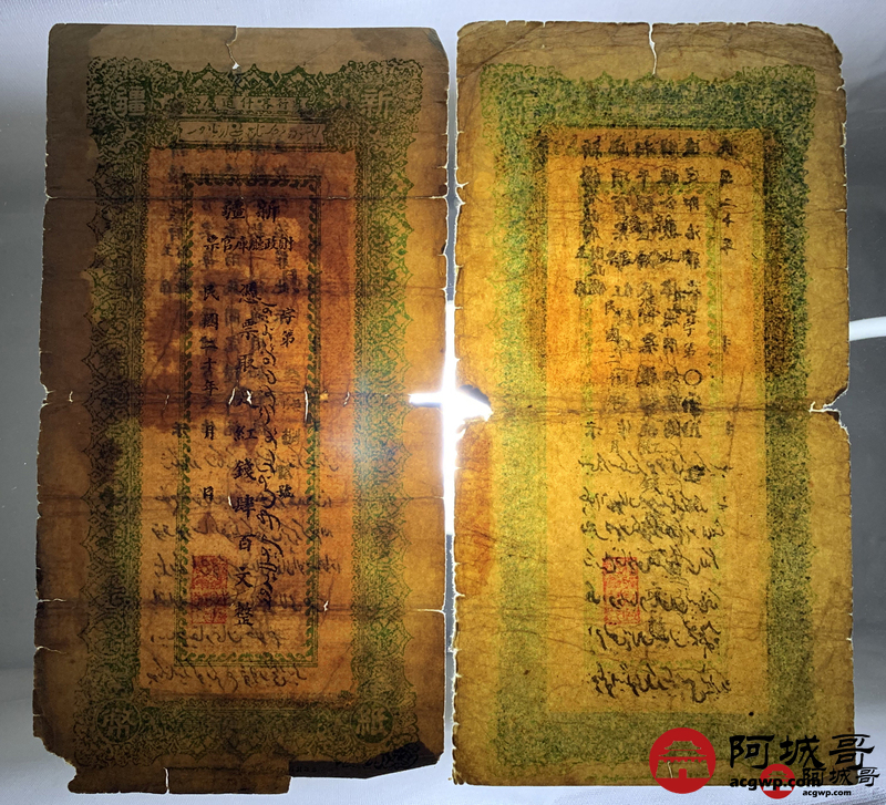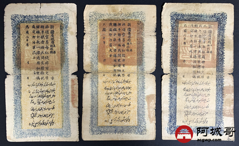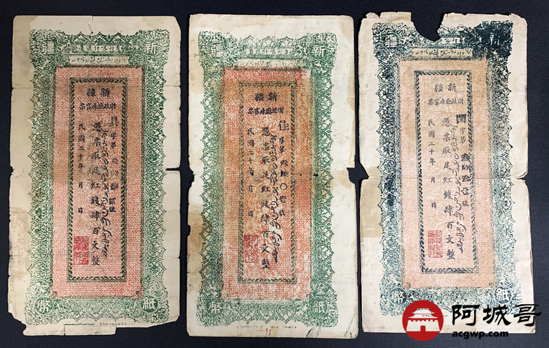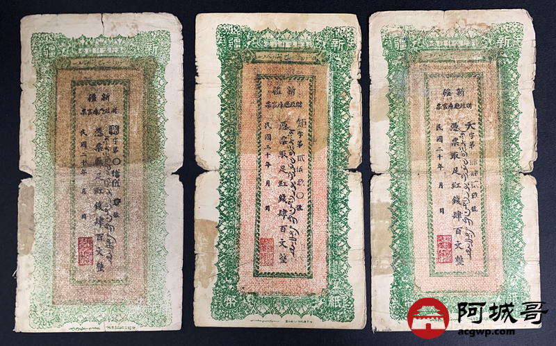 Lot:15 民国20年 新疆财政厅库官票 红钱肆佰文整 6张 板子硬 66成新