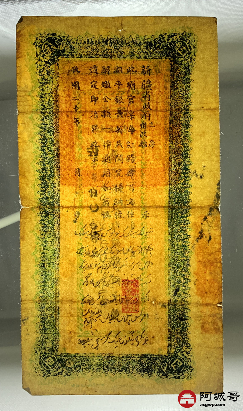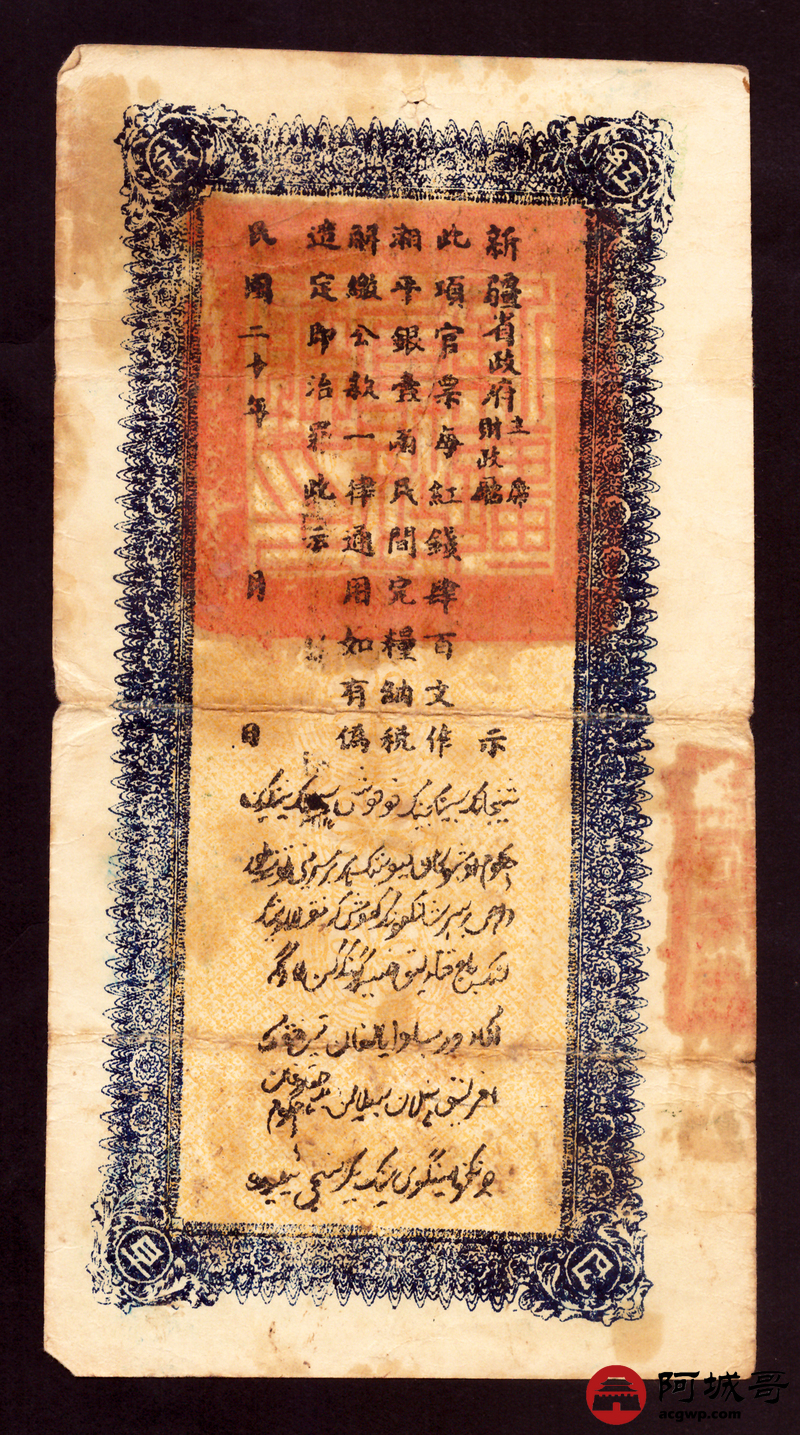Lot:29 民国20年 新疆财政厅库官票 红钱肆佰文整 约69成新