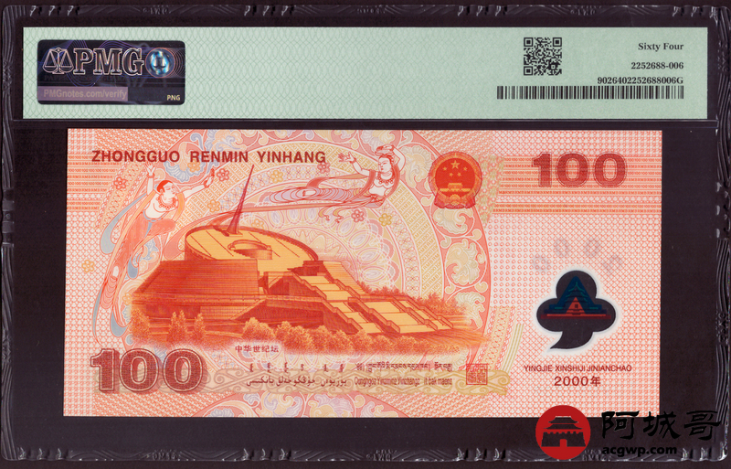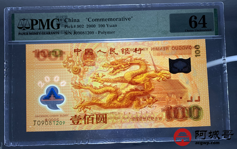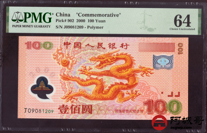 Lot:14 2000年 千禧龙钞壹佰元 PMG 64 朦胧号