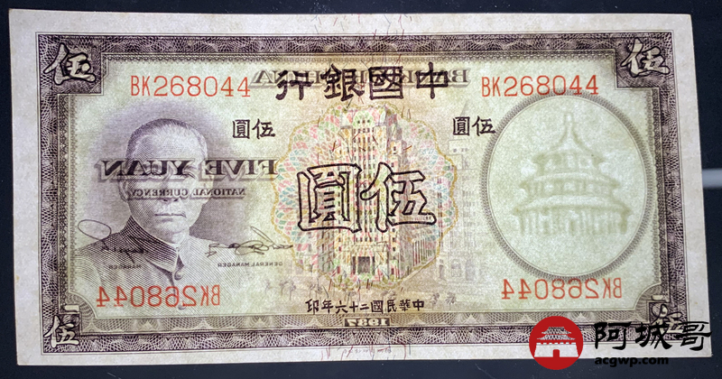 Lot:25 民国26年 中国银行 伍圆 原票97至全新