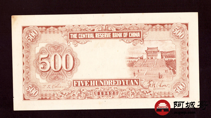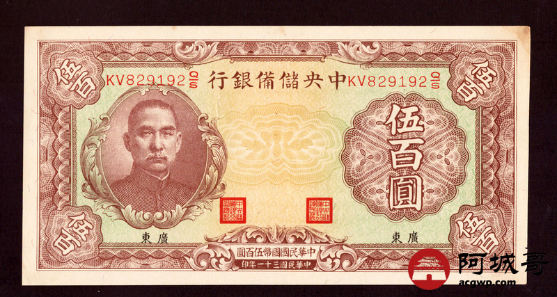 Lot:26 民国31年 中央储备银行 伍佰圆 广东地名 8至85成新 朦胧号